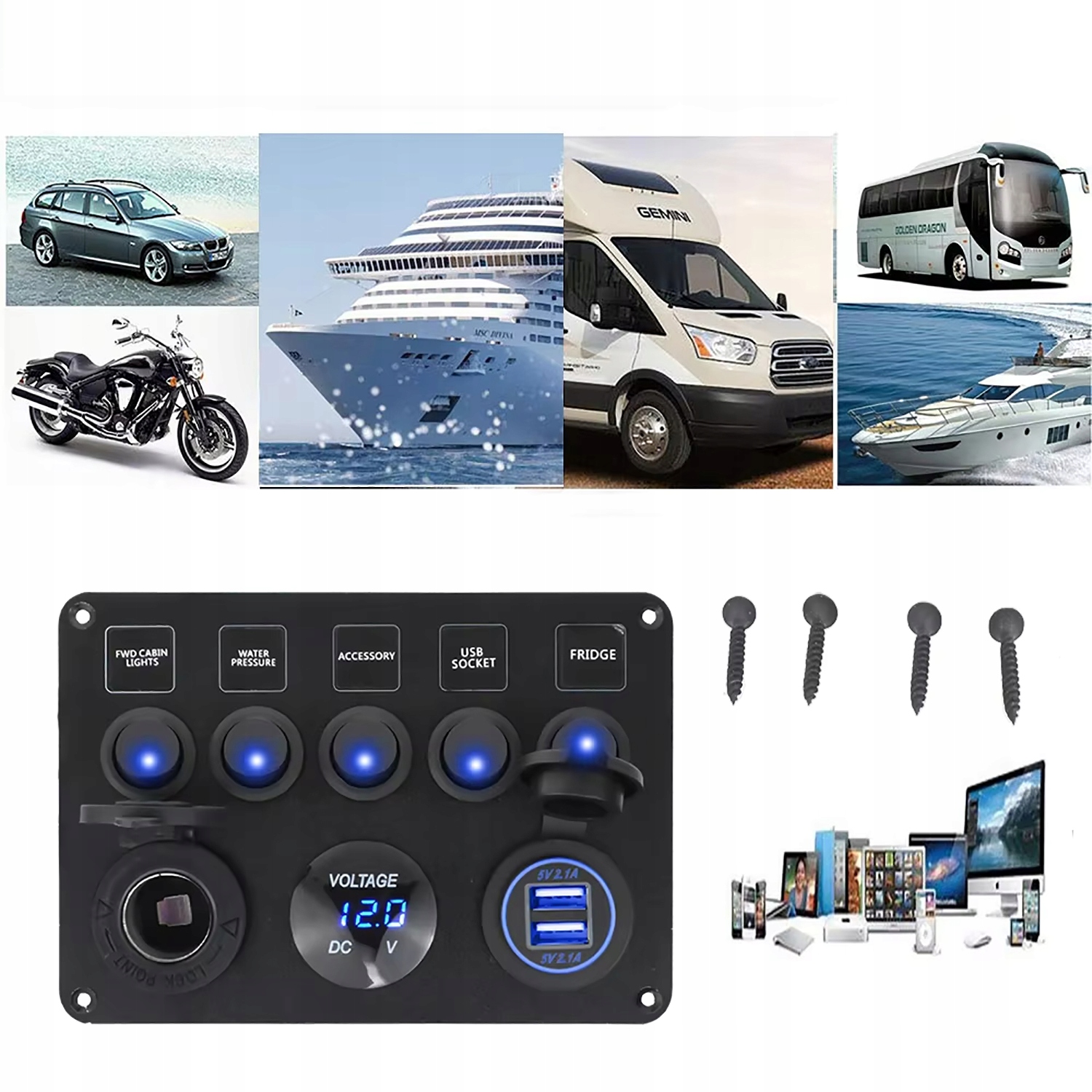 Панель управления совместима с большинством автомобилей 12 В-24 В, что делает его универсальным решением для легковых автомобилей, грузовиков, туристов, лодок, яхт, самолетов и других. Вы можете использовать его для управления освещением, аудиоустройства, насосы, вентиляторы и другие электрические устройства.