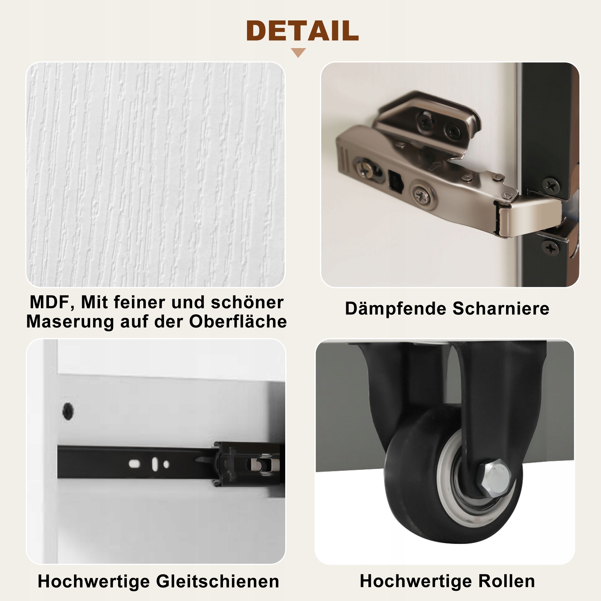 Описание товара Этот элегантный белый шкаф со стильным фасадом из янтарного стекла умело сочетает в себе две функции: С левой стороны расположен выдвижной боковой шкаф с четырьмя отделениями (каждое отделение высотой 36 см и оснащено упором 8 см для предотвращения выпадения), в котором можно хранить книги, красное вино или кухонную утварь. Ящики оснащены прочными колесами, плавно передвигаются и выдерживают нагрузку до 50 кг. Когда они не используются, их можно просто убрать и сложить. Справа находится элегантная витрина с панелями из закаленного стекла, усиленными алюминиевыми рамами и высококачественным светодиодным освещением, встроенным на каждом уровне. Будь то сумочка, коллекция или трофей – здесь можно стильно представить ваши сокровища. Он изготовлен из высококачественной древесноволокнистой плиты средней плотности с толстой задней панелью, мягкими петлями и прочными компонентами.