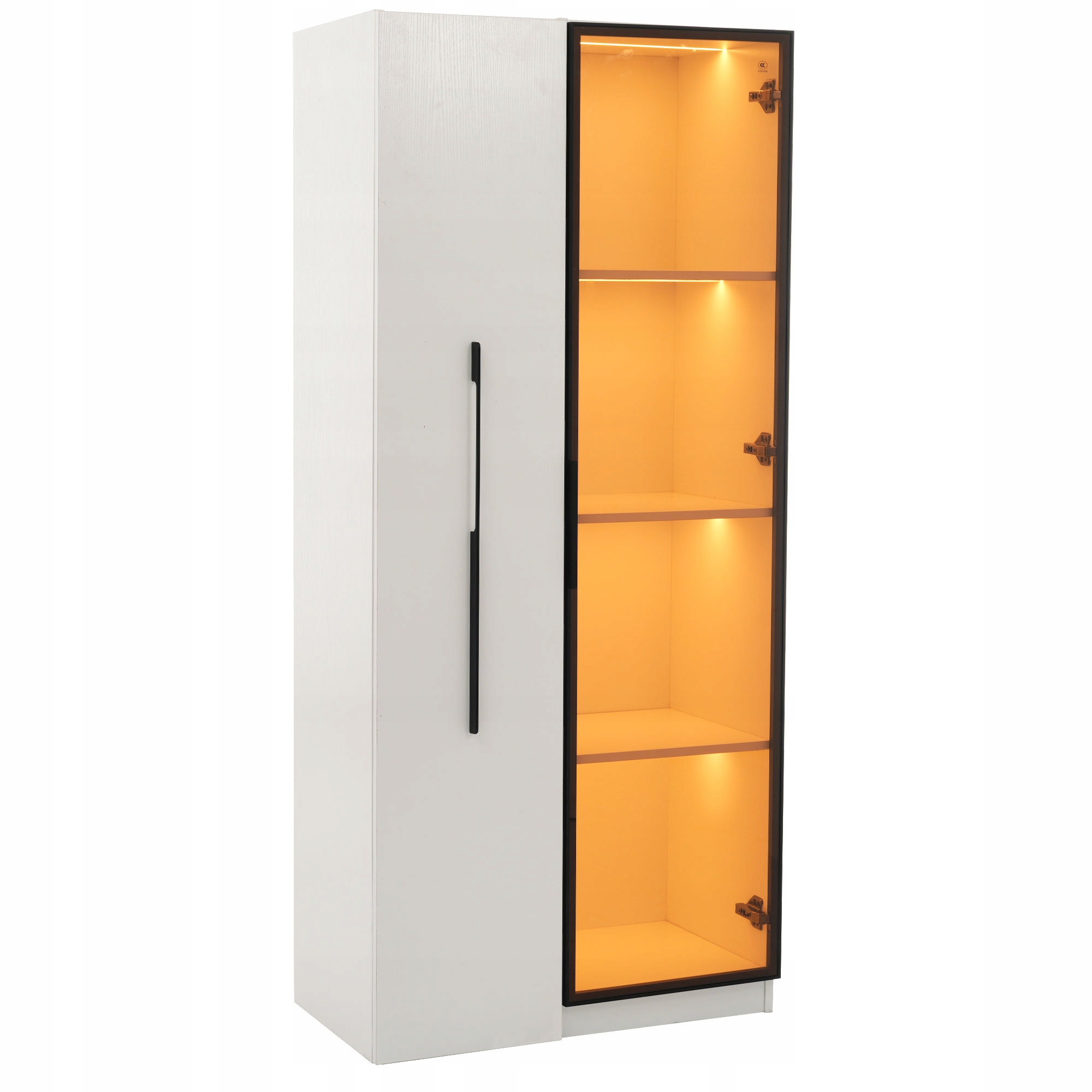 Он сочетает в себе практичный выдвижной книжный шкаф с левой стороны (с защитными полосками) и элегантную витрину со светодиодной подсветкой с правой стороны, играя двойную роль в одной конструкции.