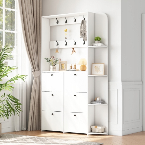 120 х 24 х 200 см, вешалка для прихожей, многофункциональная тумба для обуви 3-в-1, распашные дверцы, 8 крючков, компактный гардероб, шкаф для гостиной с 5 полками, белый