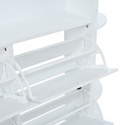 С восемью открывающимися вниз отделениями для обуви (каждое с двумя полками) вмещается до 16 пар часто ношенной обуви. Складные двери избавляют от необходимости наклоняться или приседать, что делает их особенно удобными для пожилых людей и беременных женщин.