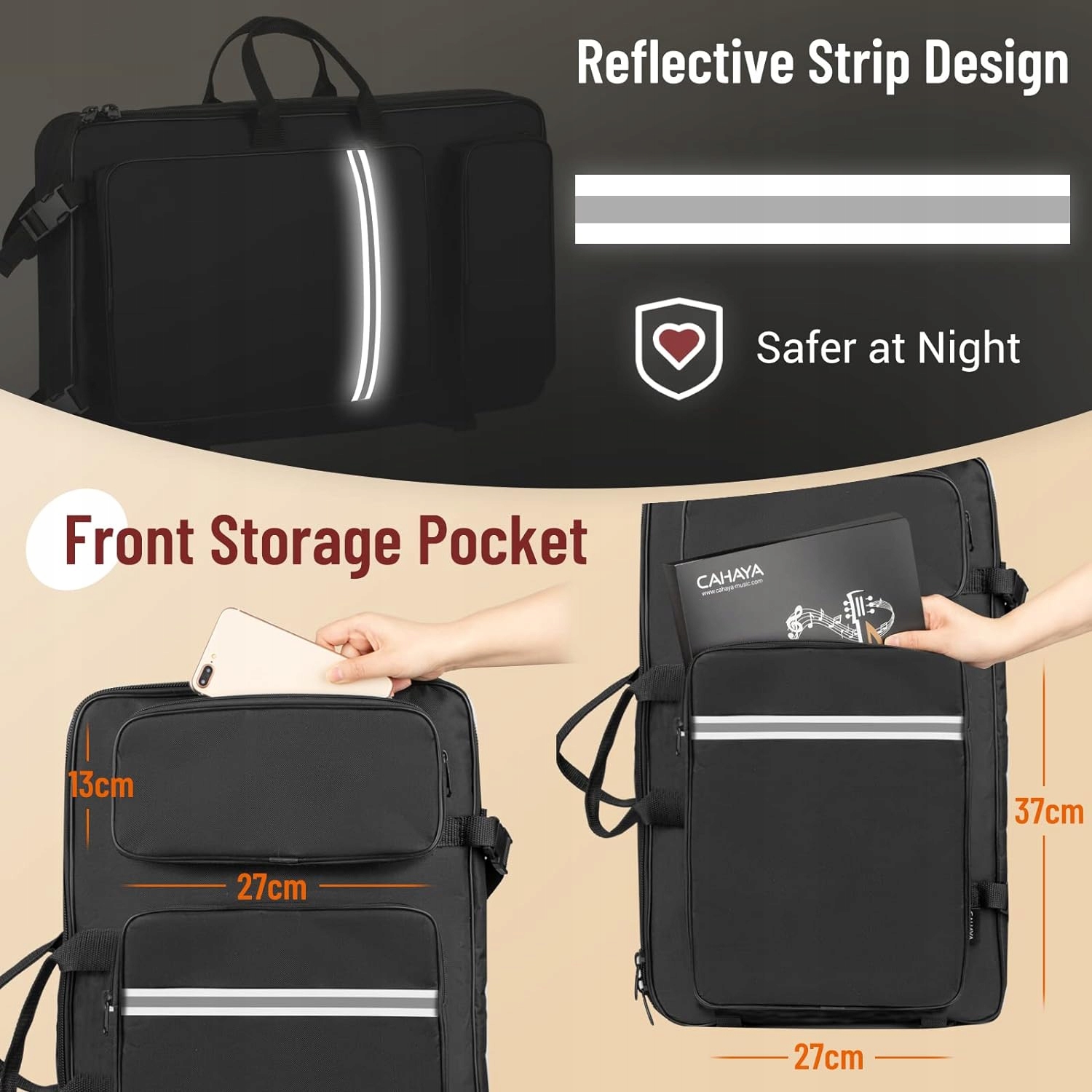 Размер нижнего кармана: 27 x 37 см. см, можно разместить предметы немного большего размера, например папки с музыкой, планшеты и т. д.