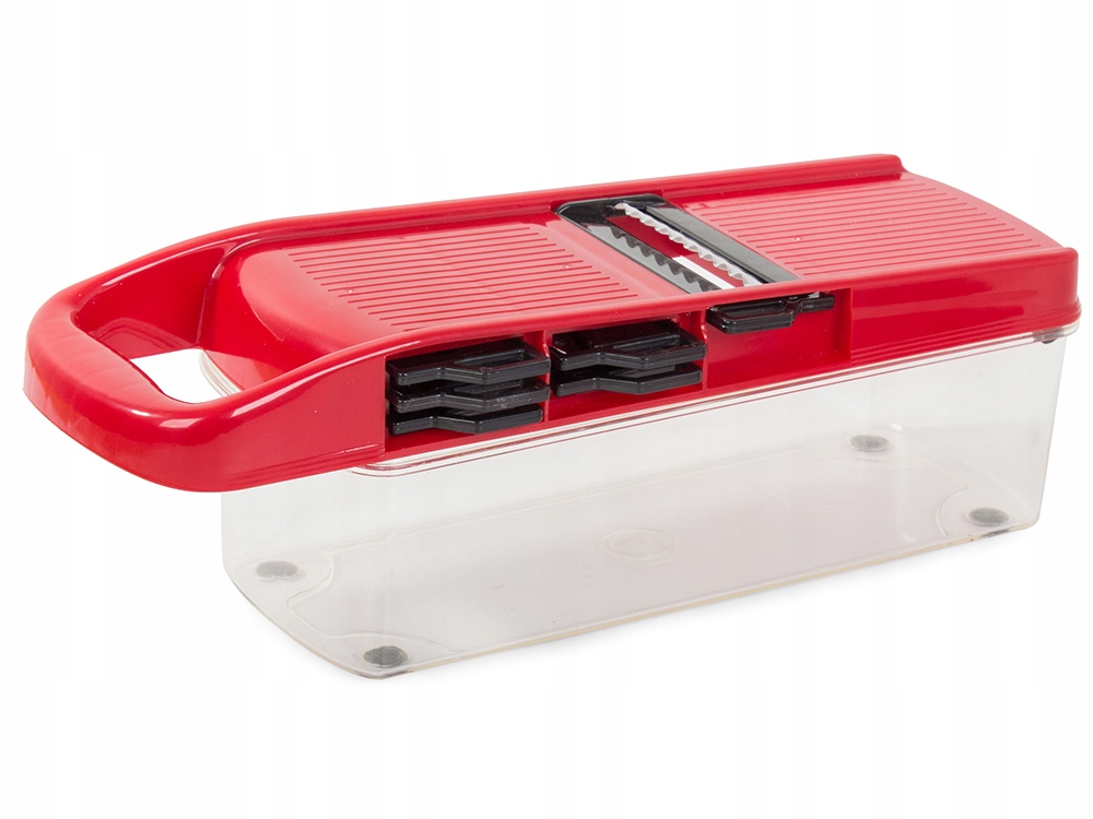 В комплект входят шесть сменных лезвий, ручка и ножовка. Контейнер имеет нескользящие ножки, обеспечивающие устойчивое положение при натирании овощей.