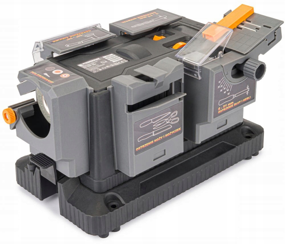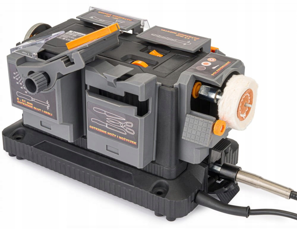 - Точилка 8 в 1: Сверла из быстрорежущей стали, ножи и ножницы, долота и рубанки, цепи, лезвия кусторезов, секаторы, топоры, полировка, шлифовка, фрезерование, резка, ремонт