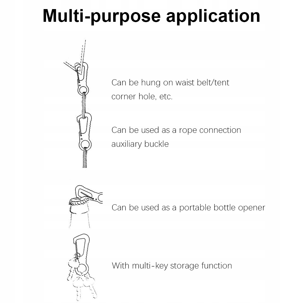 1. Благодаря универсальному использованию ее можно использовать как подвесную пряжку, вспомогательную соединительную пряжку, открывалку для бутылок, брелок для хранения. 2. Этот карабин можно повесить на поясной ремень/угловое отверстие палатки и т. д. 3. Долговечный цвет, изысканное качество изготовления, подходит для всех. 4. Маленький и портативный, этот карабин выдерживает вес 20 кг/44,1 фунта. 5. Изготовлен из высококачественной нержавеющей стали, водонепроницаем, надежен и имеет длительный срок службы.