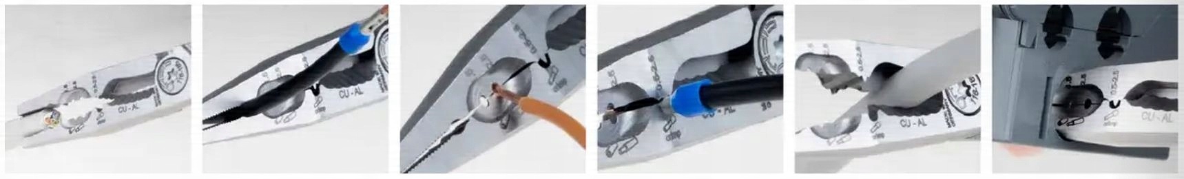 Плоскогубцы сочетают в себе семь функций в одном инструменте: удержание, сгибание, удаление заусенцев, обжатие, зачистка, резка кабелей.
