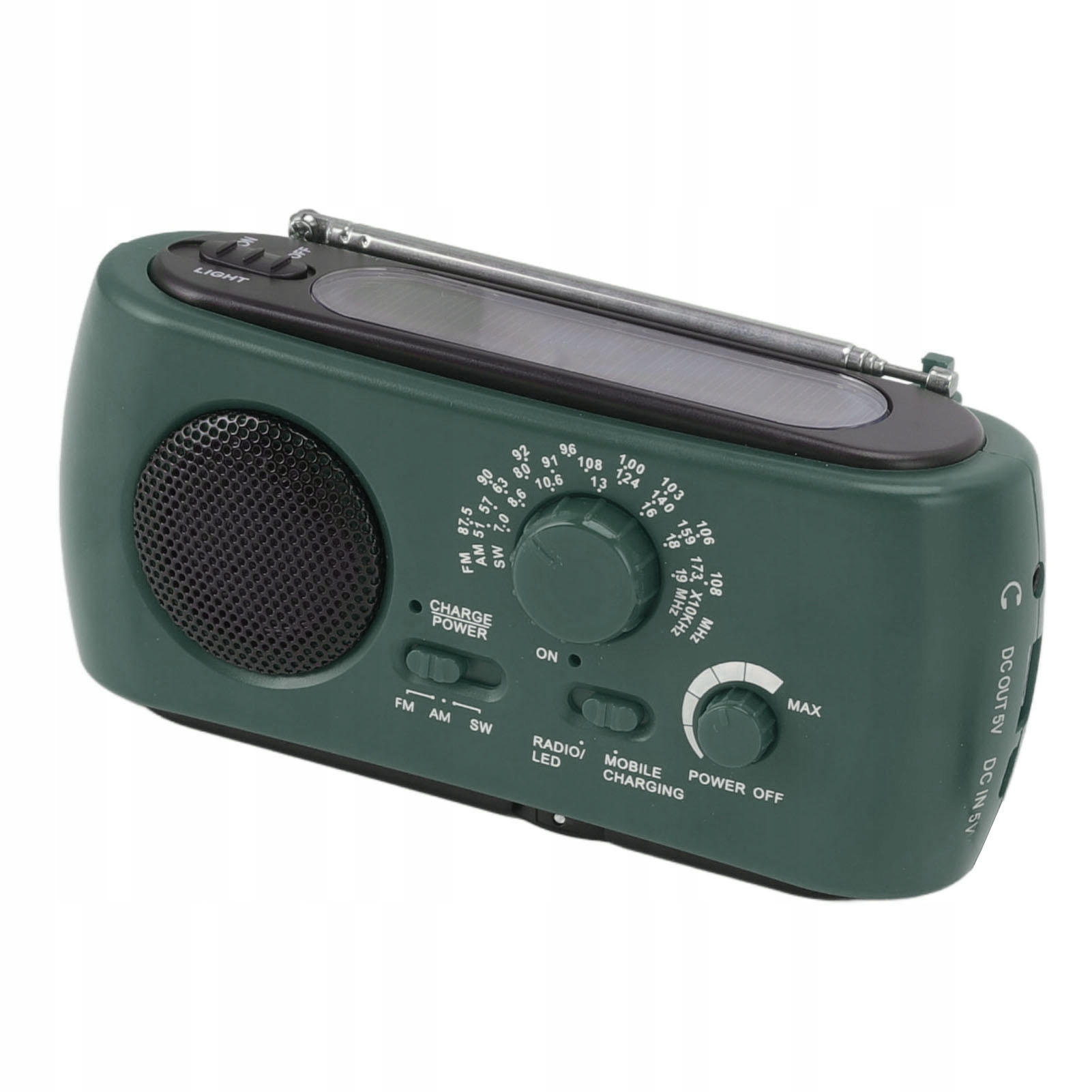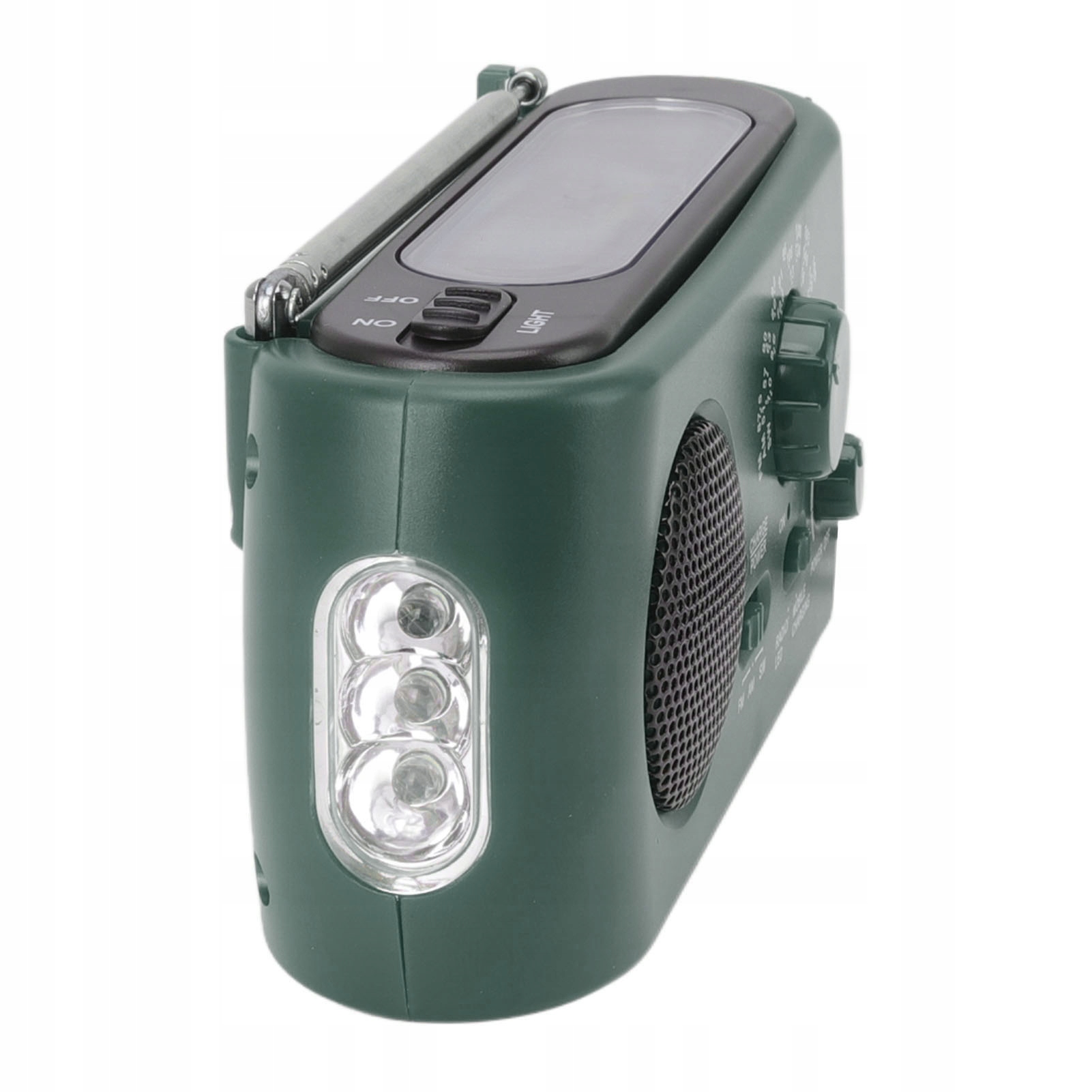 - Charging method: Solar charging, manual charging, 3 x AAA batteries (not inserted), USB charging