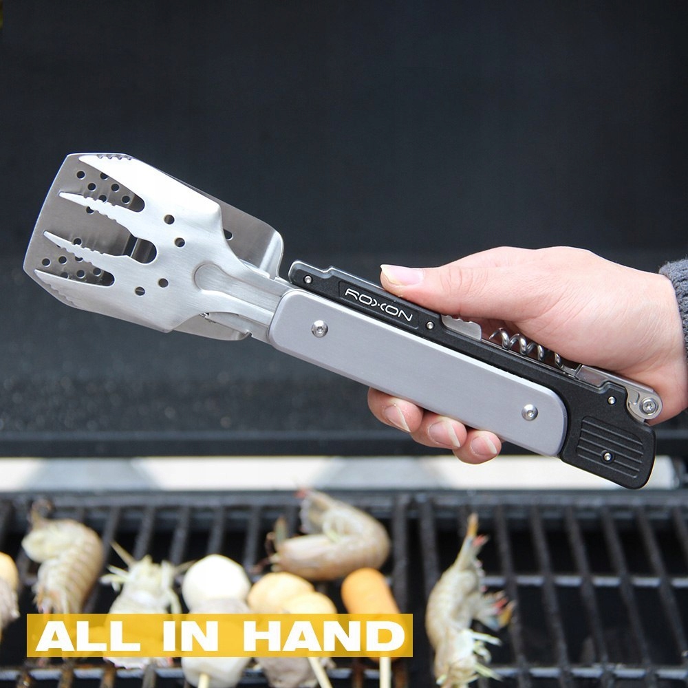 Roxon Многофункциональный инструмент для барбекю с 6-в-1-это съемный и складной набор инструментов для барбекю с шпателем, вилкой, плоскогубцами гриля, открывателем для бутылок. Портативный инструмент для барбекю во дворе и лагерь.