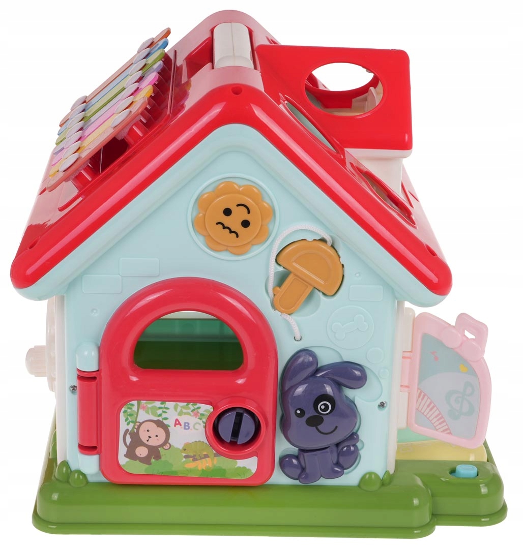 Дом стоит на зеленой траве, имеет 4 стены с различными аттракционами, красную крышу и ручку для переноски.