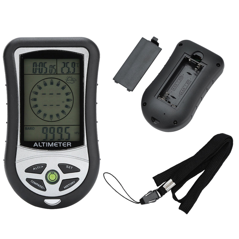 Устройство основано на технологии электронного датчика подшипника и барометрического датчика. Цифровой альтимер предназначен для наружного использования, а съемный шнурок делает цифровой компас идеальным носимым устройством в руке для различных наружных применений. Обеспечивает подсветку, когда вы давите на любую кнопку в любое время. Многофункциональный цифровой альтимер барометр Compass Прогноз погоды 8in1