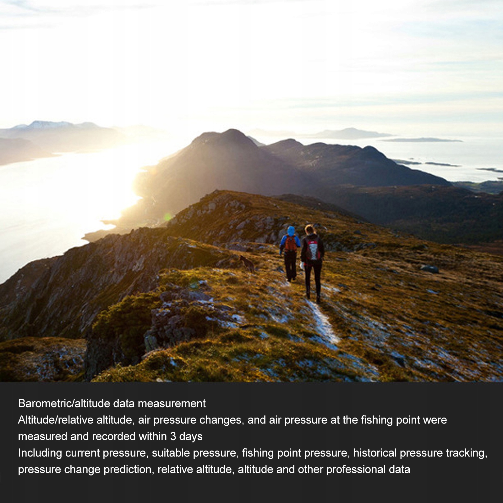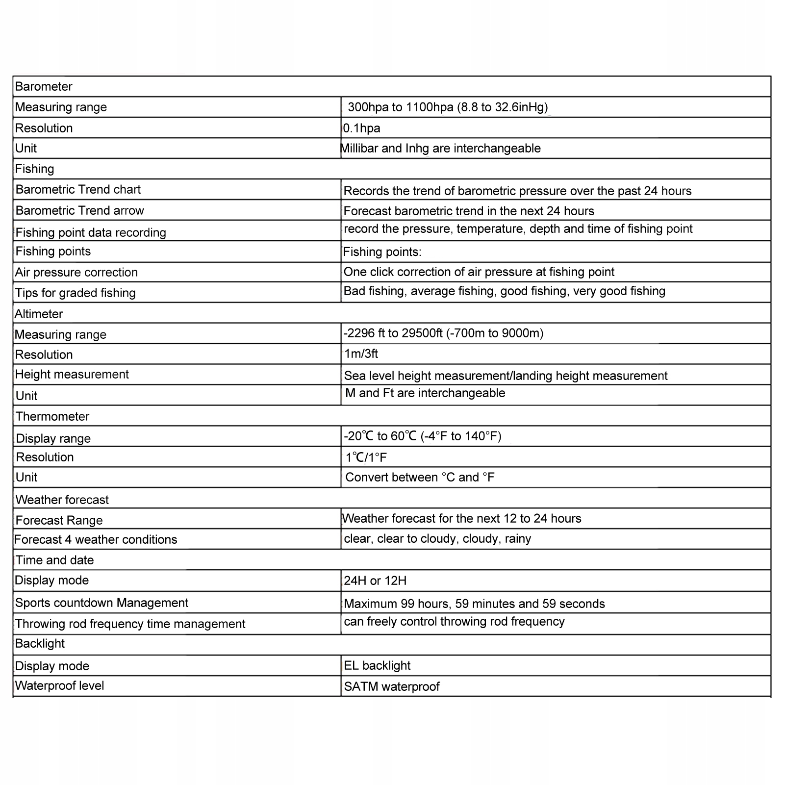 . Отслеживание давления воздуха в рыболовстве, интеллектуальное давление воздуха в промысел, напоминание иконы, индекс рыбалки, измеритель высоты (высота/относительная высота), барометр, термометр, погодный лоб, бык. Неделя, дата, тревога, максимум 99 часов, 59 минут и вычитание 59 секунд, трехдневные исторические данные давления воздуха и экономия разности температуры, давление воздуха при 6 точках рыболовства, ручная запись глубины воды, 24-часовая диаграмма изменений давления воздуха, тенденция к изменению воздуха, эль-саунджолл, ключевой сигнал, частота, иногда водная сопротивление 5ATM