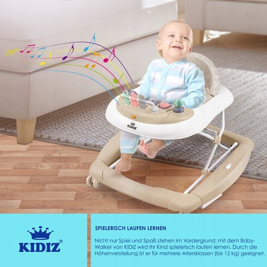 Kidiz Гибкие, многофункциональные дети -в премиальной версии, с регулировкой высоты, встроенной функцией качания, могут использоваться в качестве зоны игры, обучения и в качестве таблицы кормления. > Красочный мир веселья для удовольствия для поиска - кнопки, гремучие, захватывающие и поворотные упражнения, а также звуки, свет и 12 различных мелодий. Reach for this product now and stimulate and support the motor and sensory development of your child thanks to this walker!