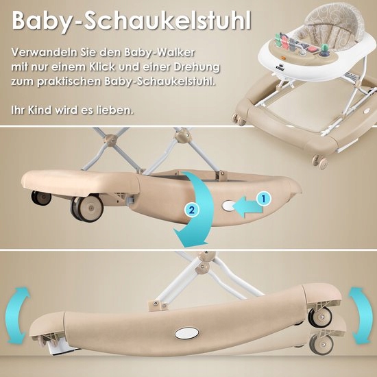 Безопасность: защитные 360 бамперы обеспечивают надежную защиту как для ребенка, так и для мебели. 6 сильных резиновых стопоров предотвращает препятствия и края. Тихие колеса деликатны для пола и ушей. Два колеса Rotary 360 позволяют легко управлять рулевым управлением и управлять ходоком. Замок стопора является твердым и удаленным, предотвращая произвольное движение устройства. Ребенок и его можно использовать для веса 12 кг. Сильная подготовка назад обеспечивает адекватную поддержку спины ребенка. Благодаря съемной зоне игр, ходунки можно преобразовать в стол для кормления в мгновение ока. Безопасный материал PP позволяет уборке. Богатая, красочная игровая зона для вашего ребенка. После интенсивной игры и обучения ваш ребенок обязательно захочет отдохнуть. С одним щелчком и вращением ходунок может быть преобразован в практичный рокер. Ваш малыш и вам понравится это решение! Полем Просто сложите его, затем безопасно и сохраните место - будь то дома под кроватью или в стволе машины во время путешествия. Материал соответствует европейским стандартам безопасности для игрушек EN 71.
