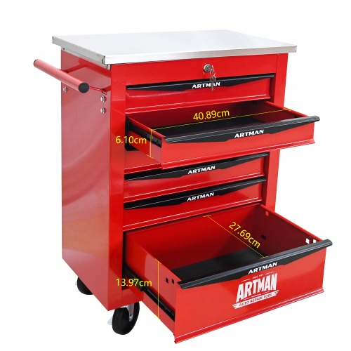 Прочная стальная конструкция с порошковым покрытием обеспечивает высокую износостойкость. Тележка имеет четыре поворотных колеса, два из которых имеют тормоза, что позволяет тележке свободно перемещаться по гаражу или останавливаться на месте.