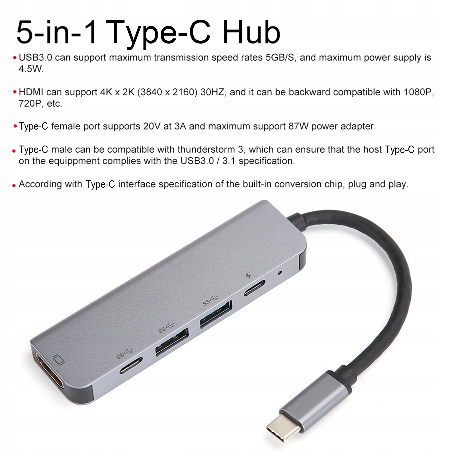 1. Максимальная скорость передачи данных USB3.0 составляет 5 ГБ/с, а максимальная мощность источника питания составляет 4,5 Вт. 2. HDMI поддерживает разрешение 4K x 2K (3840 x 2160). 30 Гц и может иметь обратную совместимость с разрешением 1080P, 720P и т. д. 3. Гнездовой порт типа C поддерживает напряжение 20 В при токе 3 А и максимальную мощность источника питания 87 Вт. 4. Вилка типа C может быть совместима с Thunderstorm 3, что может гарантировать соответствие типа устройства. Хост-порт -C соответствует спецификации 3.0/3.1. 5. В соответствии со спецификациями интерфейса Type-C встроенного преобразовательного чипа, подключи и работай.