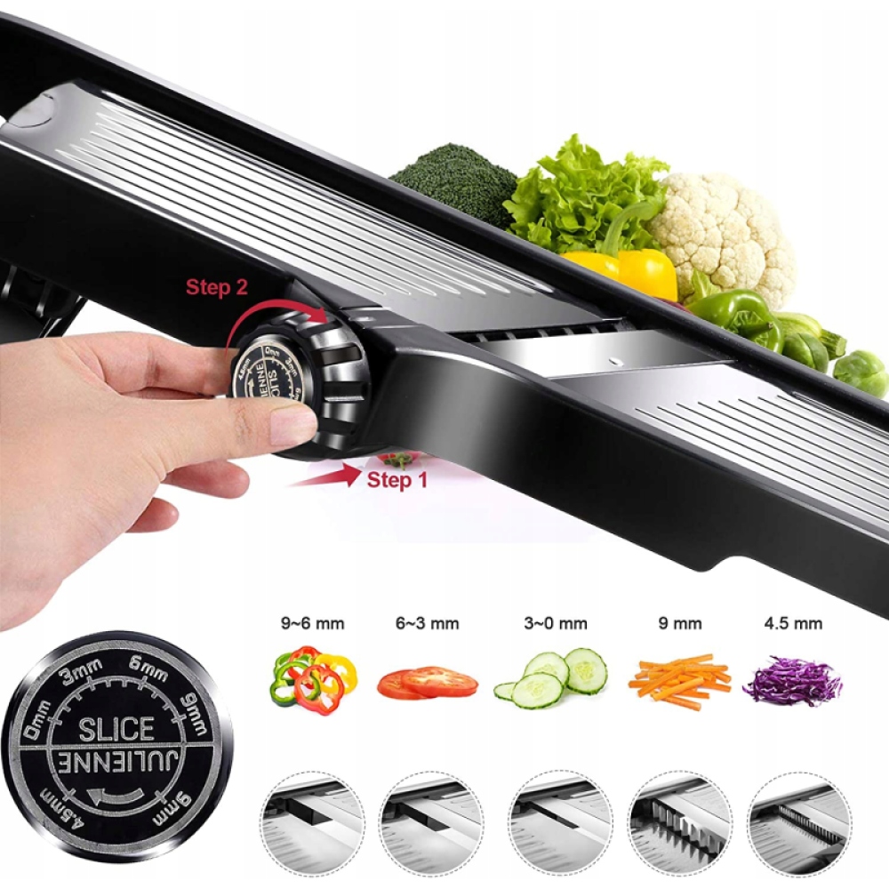 Благодаря конструкции ручки V -образное лезвие может быть адаптировано к пяти различной толщине резки в зависимости от ваших потребностей. Следовательно, овощи можно разрезать на равные 3 мм, 6 мм, 9 мм, быстро и без усилий. 4,5 мм и 9 мм толщиной.