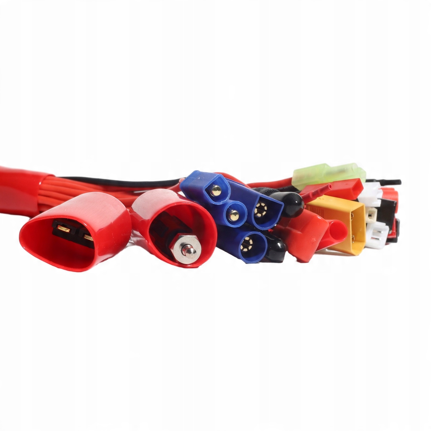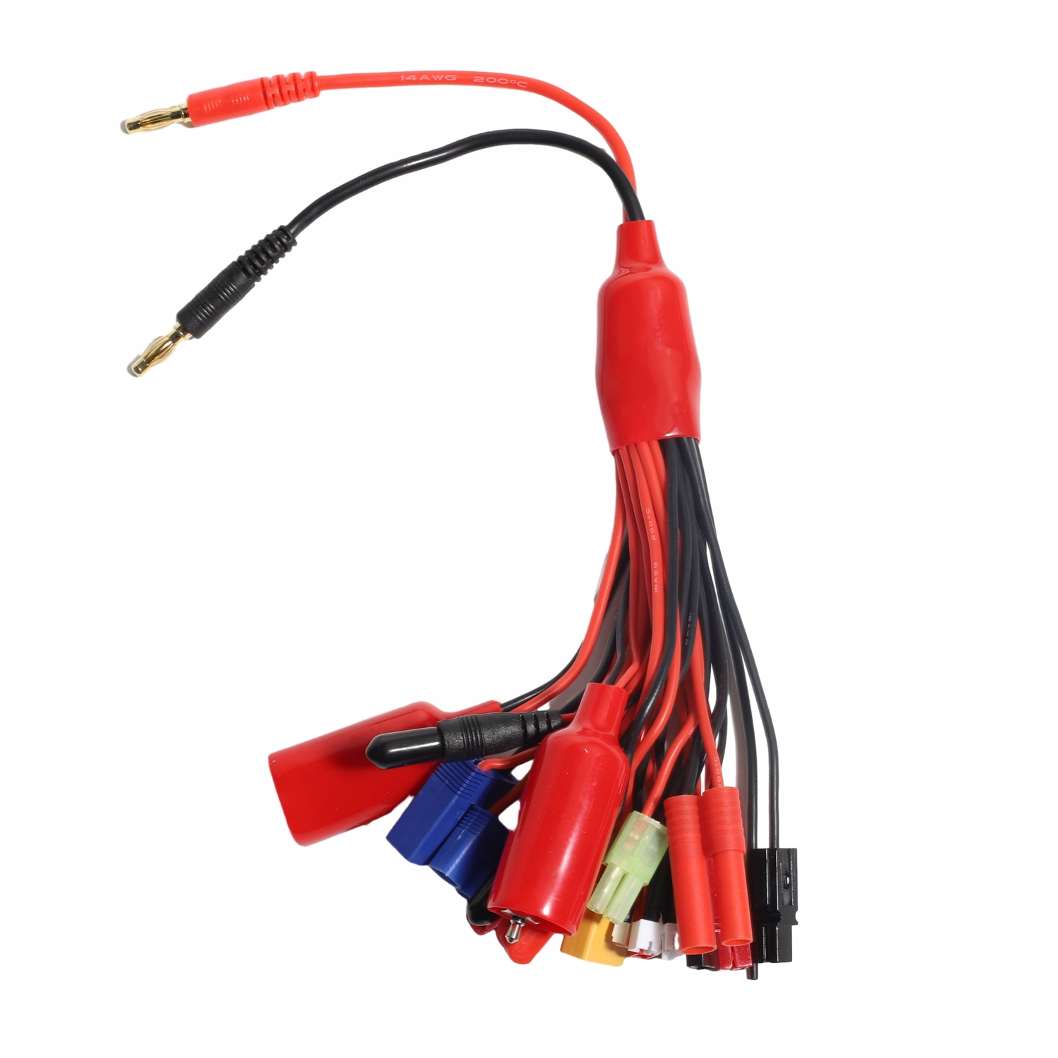 - Многофункциональные зарядные адаптеры, состоящие из 19 зарядных устройств в одном, оснащены штекерами типа «банан» диаметром 4 мм, которые подходят к большинству стандартных зарядных устройств, включают в себя следующие разъемы: XT90, светящаяся лампа, mini Deans Ultra-type, JP TX, mCP X, EC5( E- Flite), Futaba J servo*2, Tamiya, Fuatba TX, Anderson Power полюсы, JST, EC3 (E-Flite), Trasxxas, Anderson Power полюсы RED, Deans Ultra-type, Mini Tamiya, mCX, HXT 4MM li>