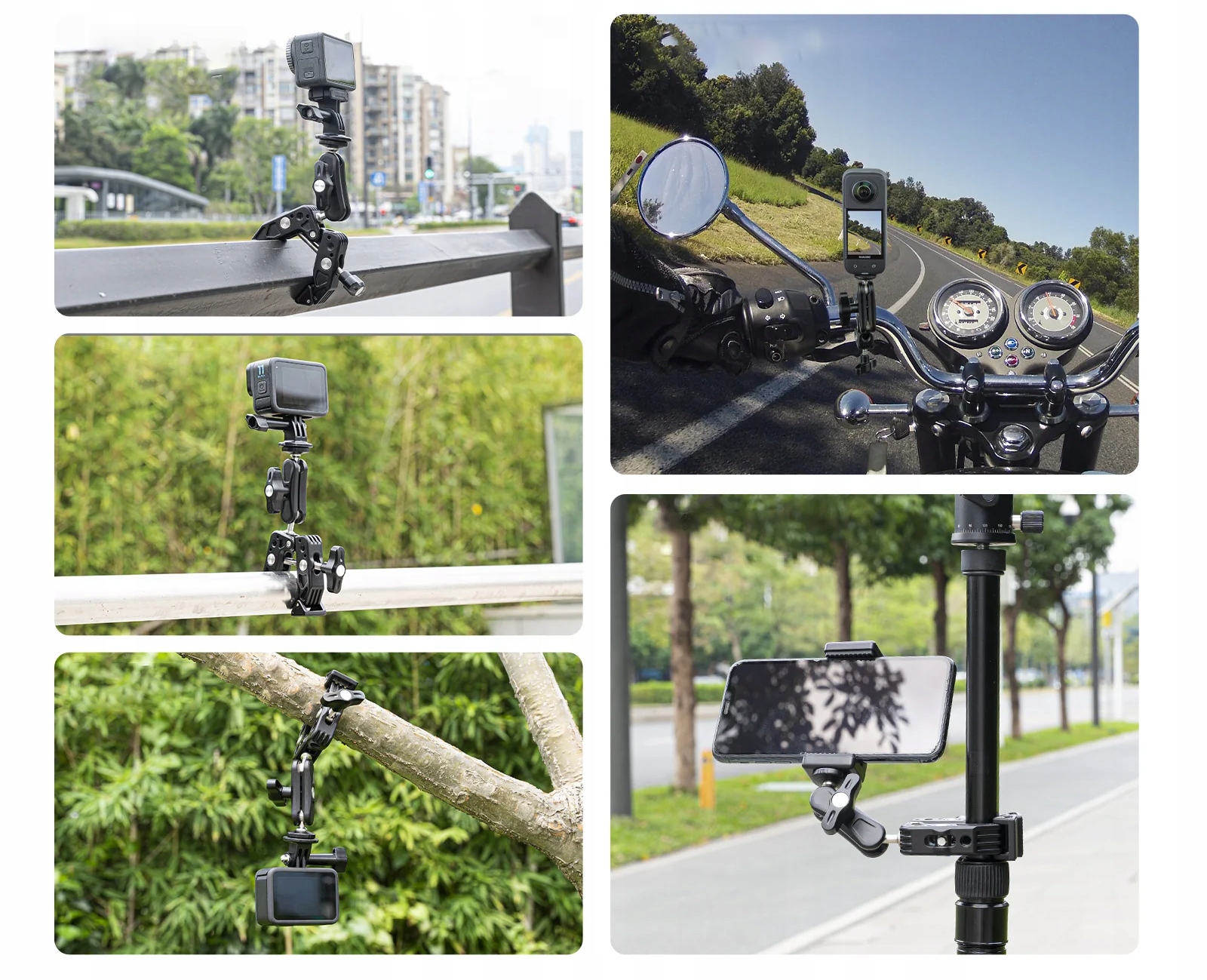 - ✔️ Многофункциональность: Зажимной держатель Telesin — это универсальный инструмент, который можно использовать во многих ситуациях и на различных поверхностях, например в качестве руля велосипеда, мотоцикла, поручня, штатива или ветки.