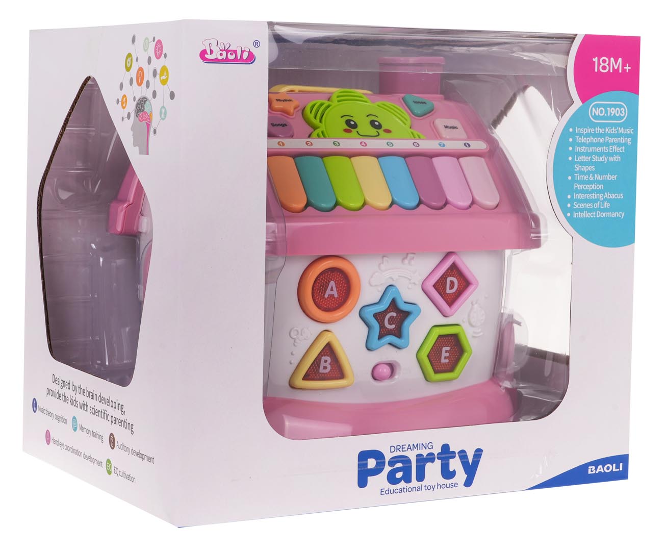 Интерактивный, образовательный дом для детей с 18 месяцев. Коттедж изготовлен из пластика высочайшего качества, в ярких цветах, приносящих глаза ребенка и поощряет образовательное веселье. В доме есть 4 стена, предлагающие различные достопримечательности, розовую крышу и ручку для переноски. Игрушка питается на 3 x AA 1,5 В батареи (не входит в комплект). Набор также включает в себя розовый автомобиль.