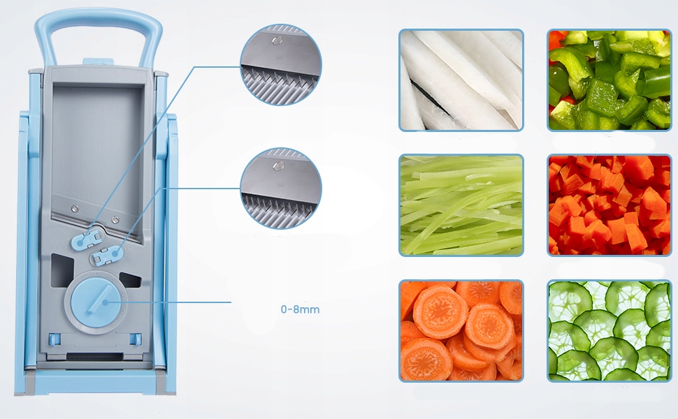 🌟 С 4 режимами на выбор: жульен, матч, нарезка ломтиками и кубиками одновременно. нет необходимости заменять лезвие. Регулируемая толщина 0,1-8 мм.