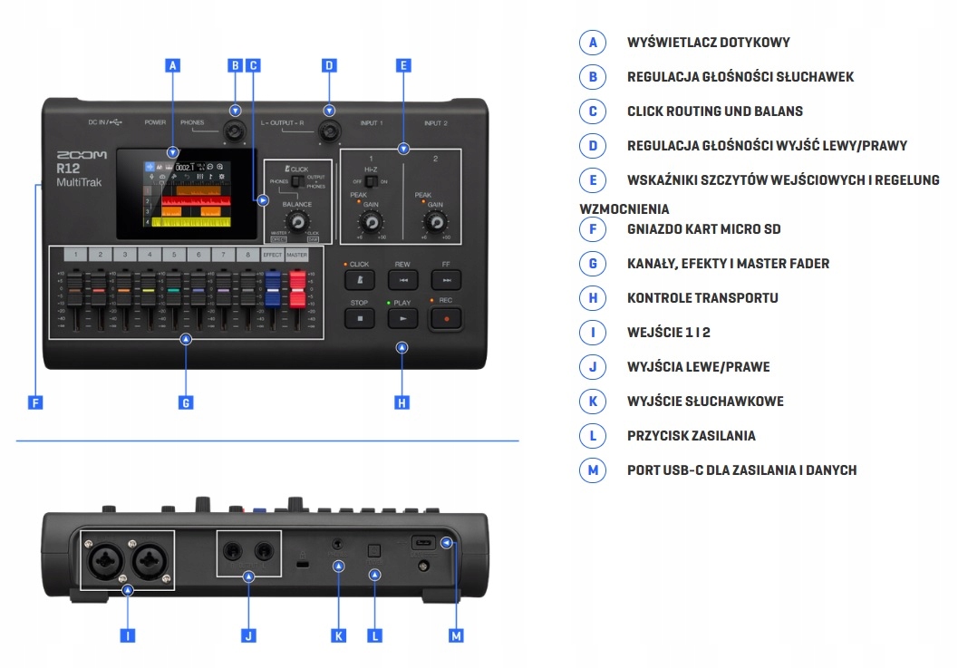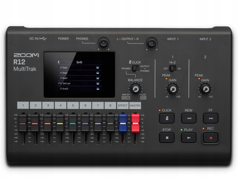 R12 был разработан для музыкантов, которые живут музыкой. И которые хотят иметь свободу создавать музыку, где бы они ни находились. Благодаря компактному и портативному дизайну вы можете записывать, редактировать и микшировать песни без компьютера. Полноцветный сенсорный ЖК-экран R12 позволяет с легкостью вырезать, копировать, зацикливать и редактировать треки. R12 предлагает канал отправки эффектов для реверберации, хоруса и задержки с собственным фейдером возврата эффекта. Для изысканного звучания доступны пресеты и эффекты от Zoom Guitar Lab. Кроме того, каждый канал R12 имеет панораму и 3-полосный эквалайзер, каналы 1 и 2 также имеют компрессор.