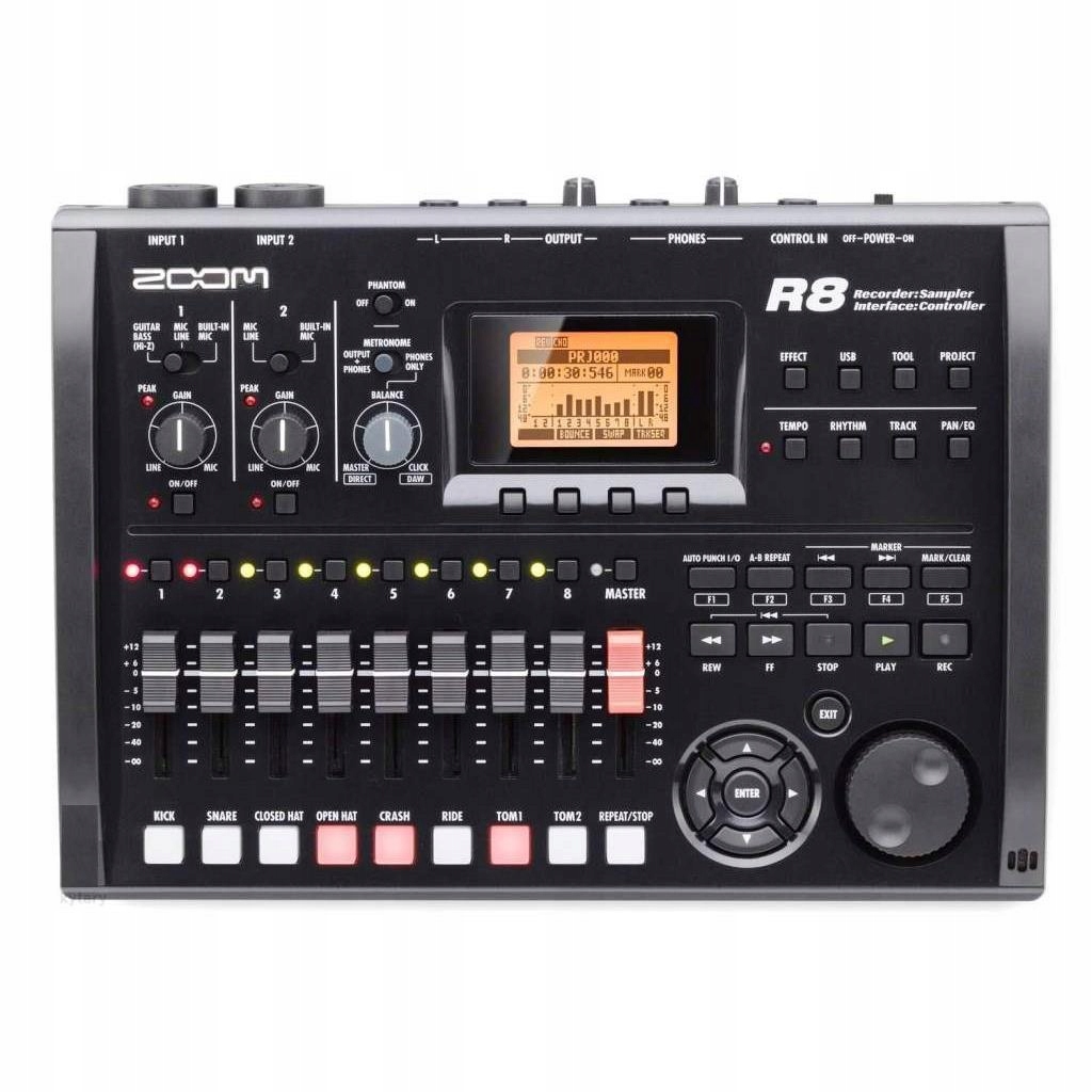 R8 — самый маленький из семейства современных многодорожечных рекордеров Zoom. Это восьмидорожечный рекордер с возможностью одновременной записи двух дорожек в аудиоформате WAV 16/24 бит/44,1/48 кГц. Помимо функций рекордера, он также служит аудиоинтерфейсом и контроллером для вашей DAW, а также генератором сэмплов и драм-треков.