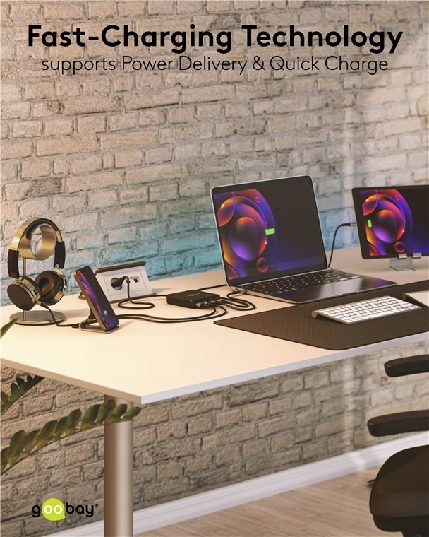 - Режим быстрой зарядки обеспечивает питание таких ноутбуков, как Apple MacBook. через USB-C™ Power Delivery при одновременной зарядке смартфонов или на высокой скорости через USB-A Quick Charge.