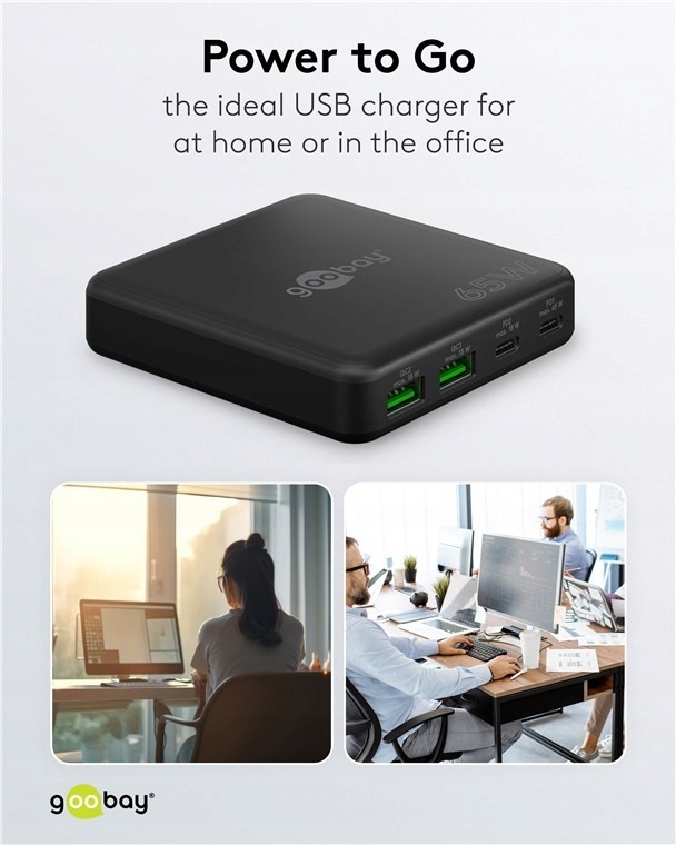 Многопортовое настольное зарядное устройство USB-C™ PD GaN (65 Вт), черное