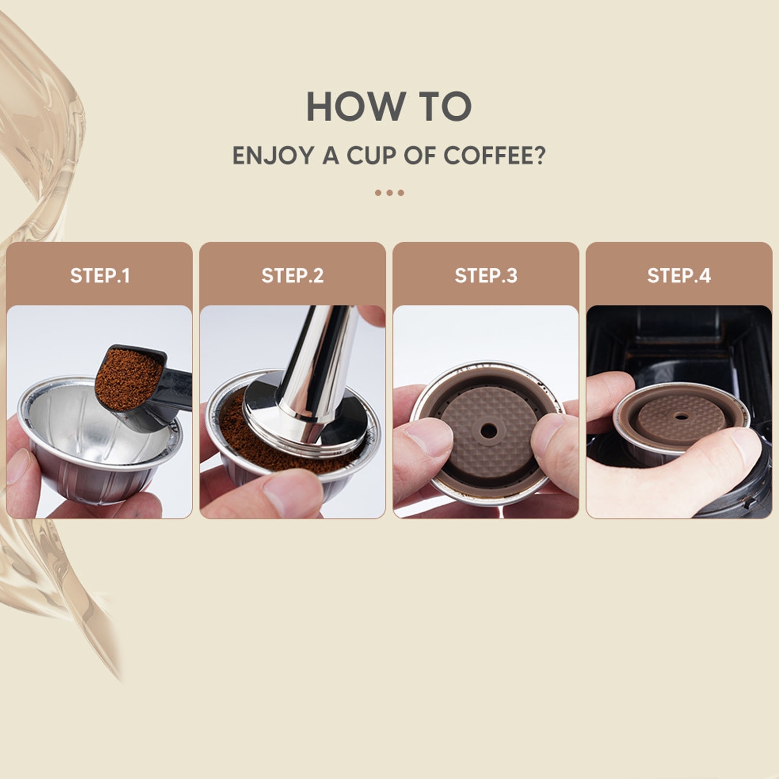 3. Простота в использовании: поместите пустую капсулу в держатель, добавьте молотый кофе (не пересыпайте), вылейте остатки кофе по краю капсулы, затем накройте силиконовый диск и слегка нажмите для лучшего запечатывания.