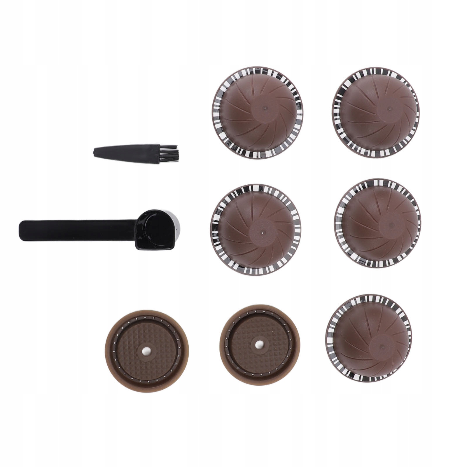 5. Набор для заправки многоразовых капсул: В комплект для заправки многоразовых капсул входят крышка многоразовой капсулы, 5 пустых капсул, мерный стаканчик и щеточка для чистки.