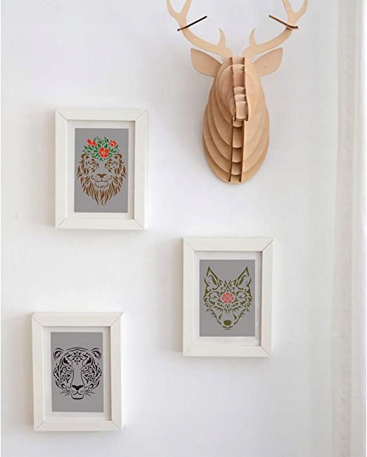 - Трафареты с головами животных:Пластмассовые трафареты с животными состоят из льва, тигра, волка, кот, собака, панда.