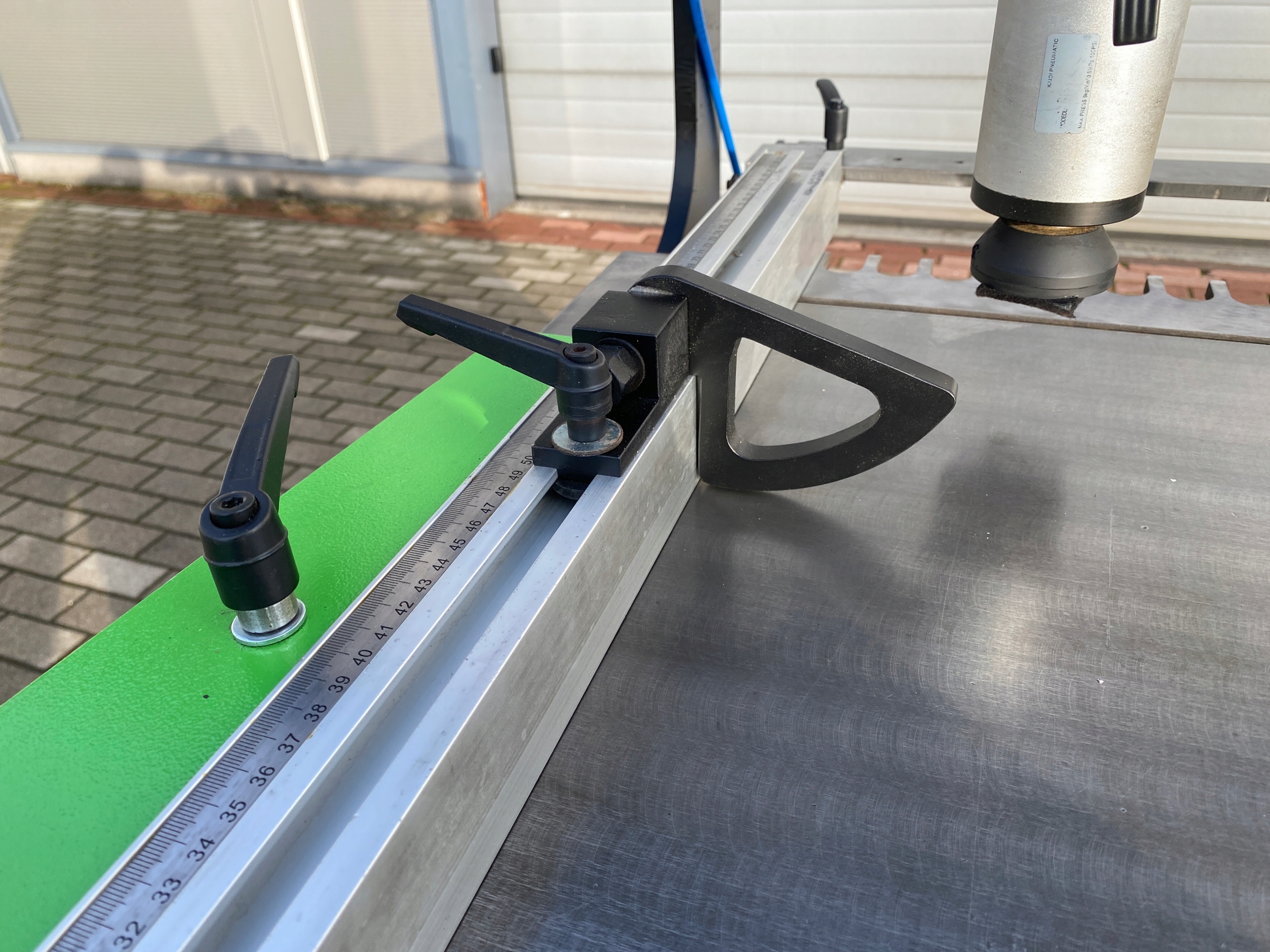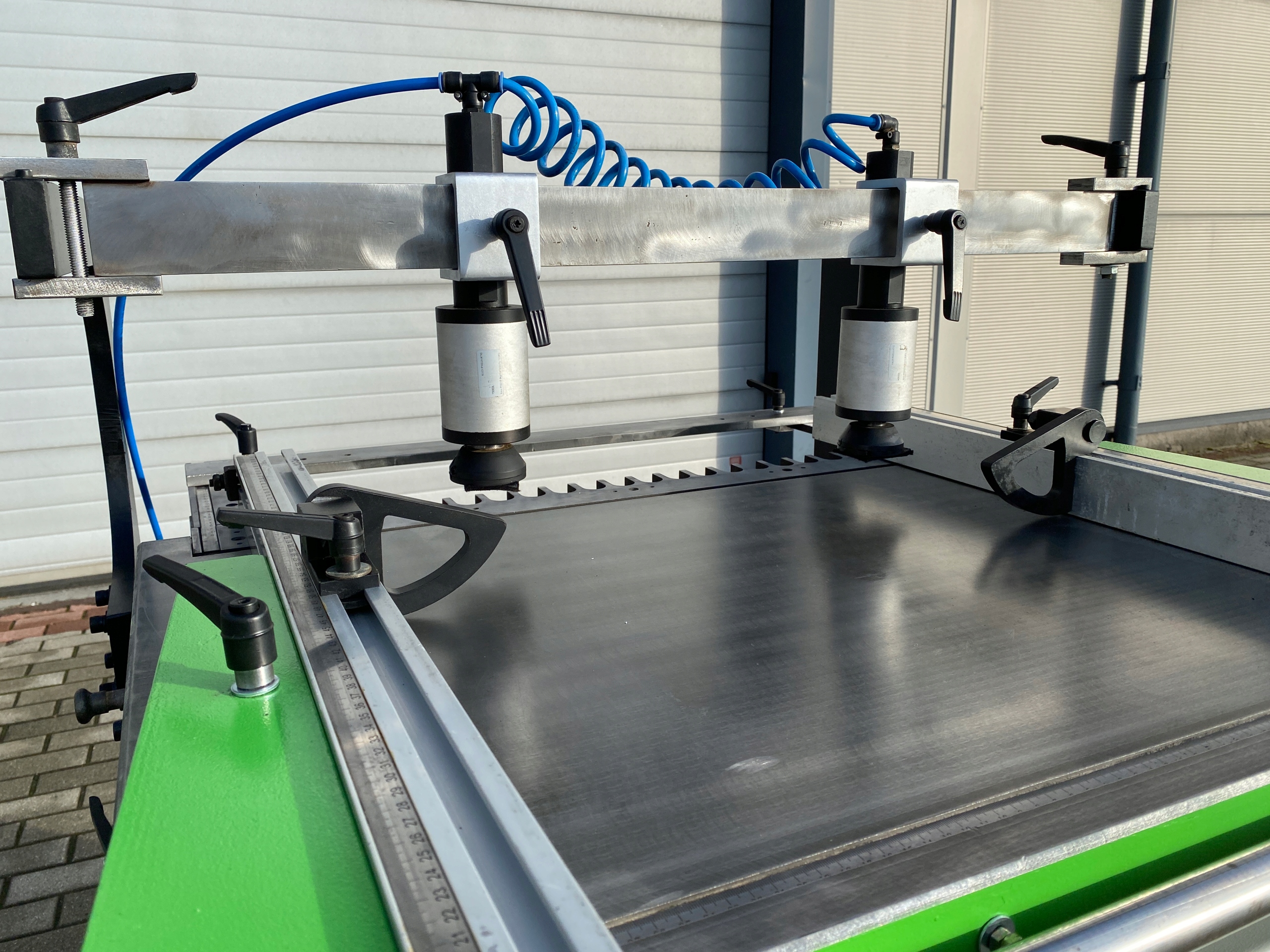 - 2 пневматических зажима материала:
