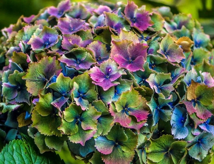 Цветы в цвете от зеленого через синий, розовый, фиолетовый, в зависимости от кислотности почвы могут быть очень фиолетовыми или фиолетовыми - розовыми в полном цвете.