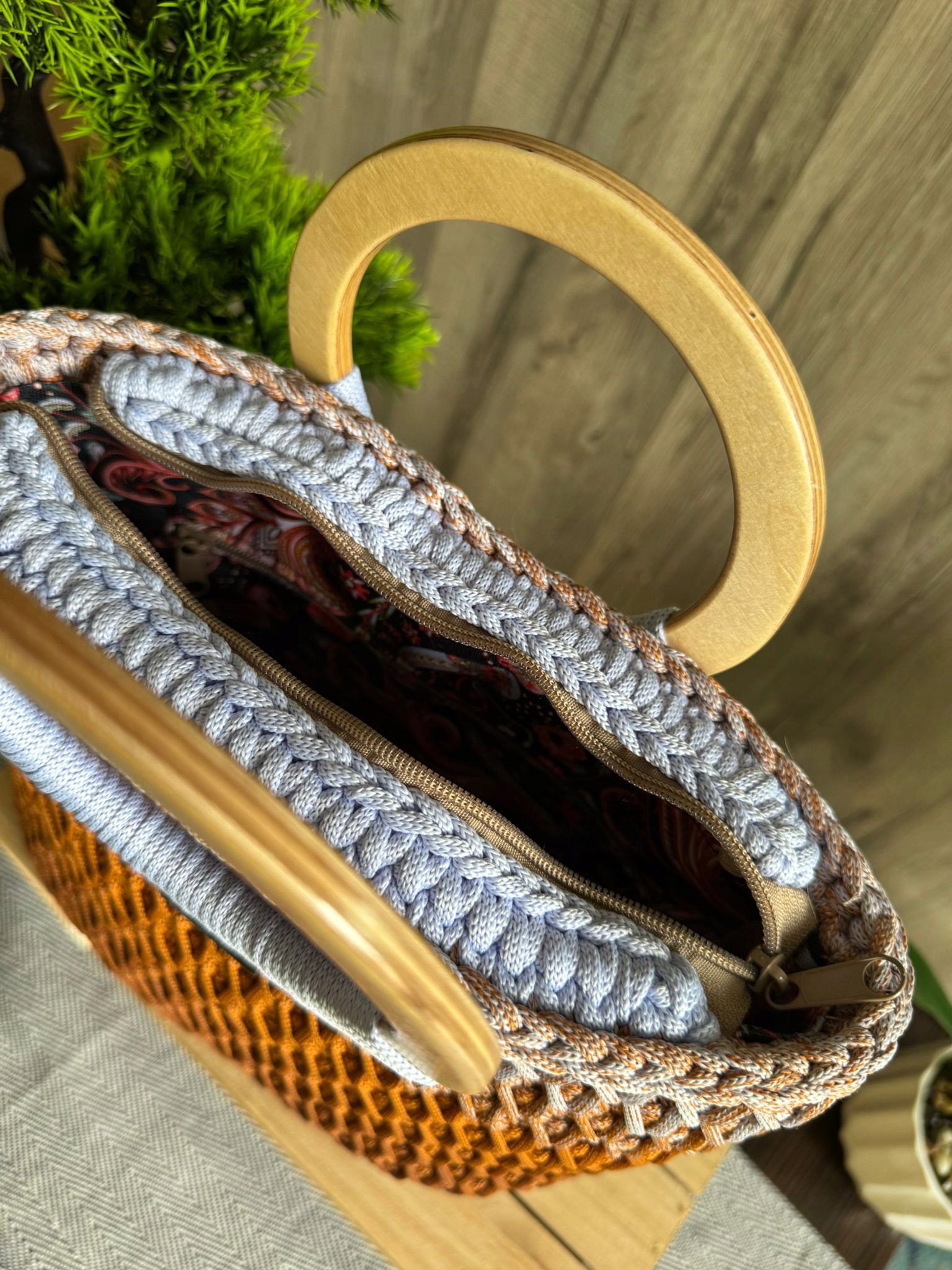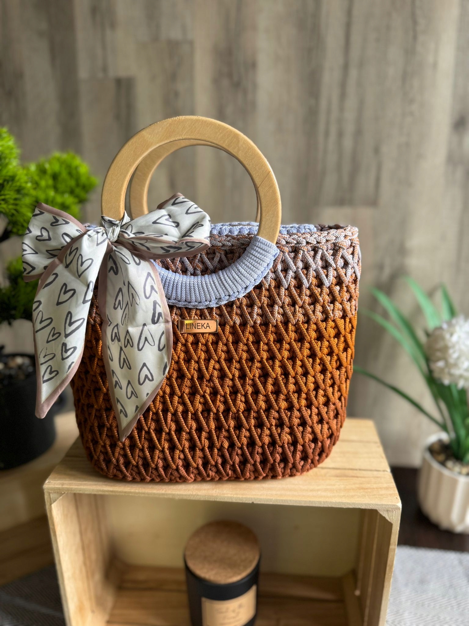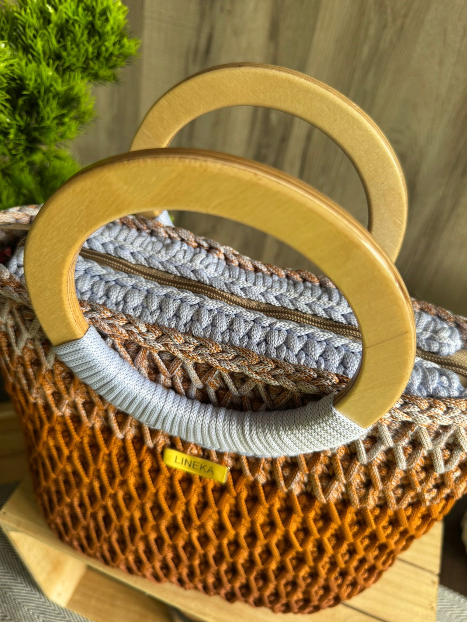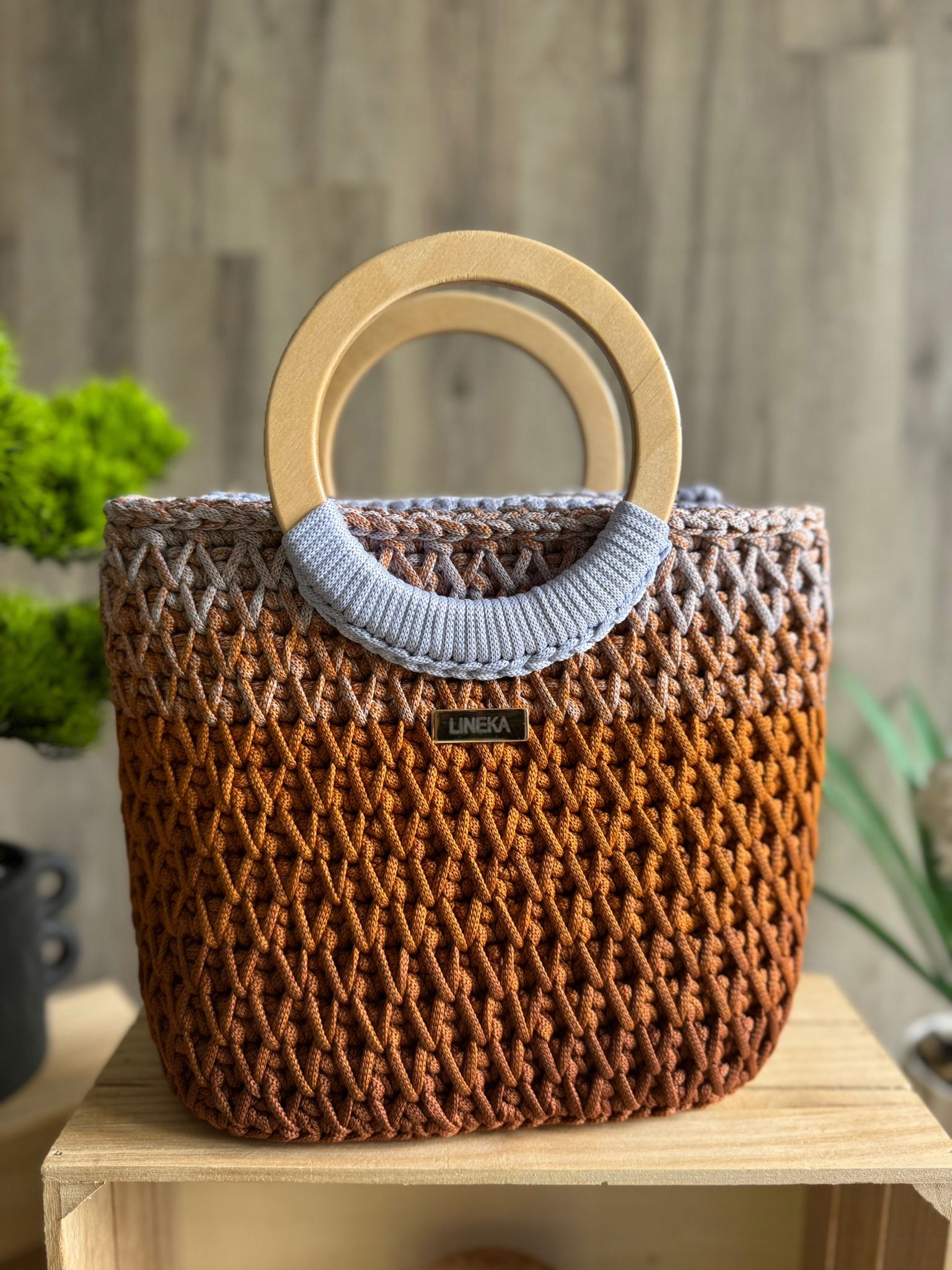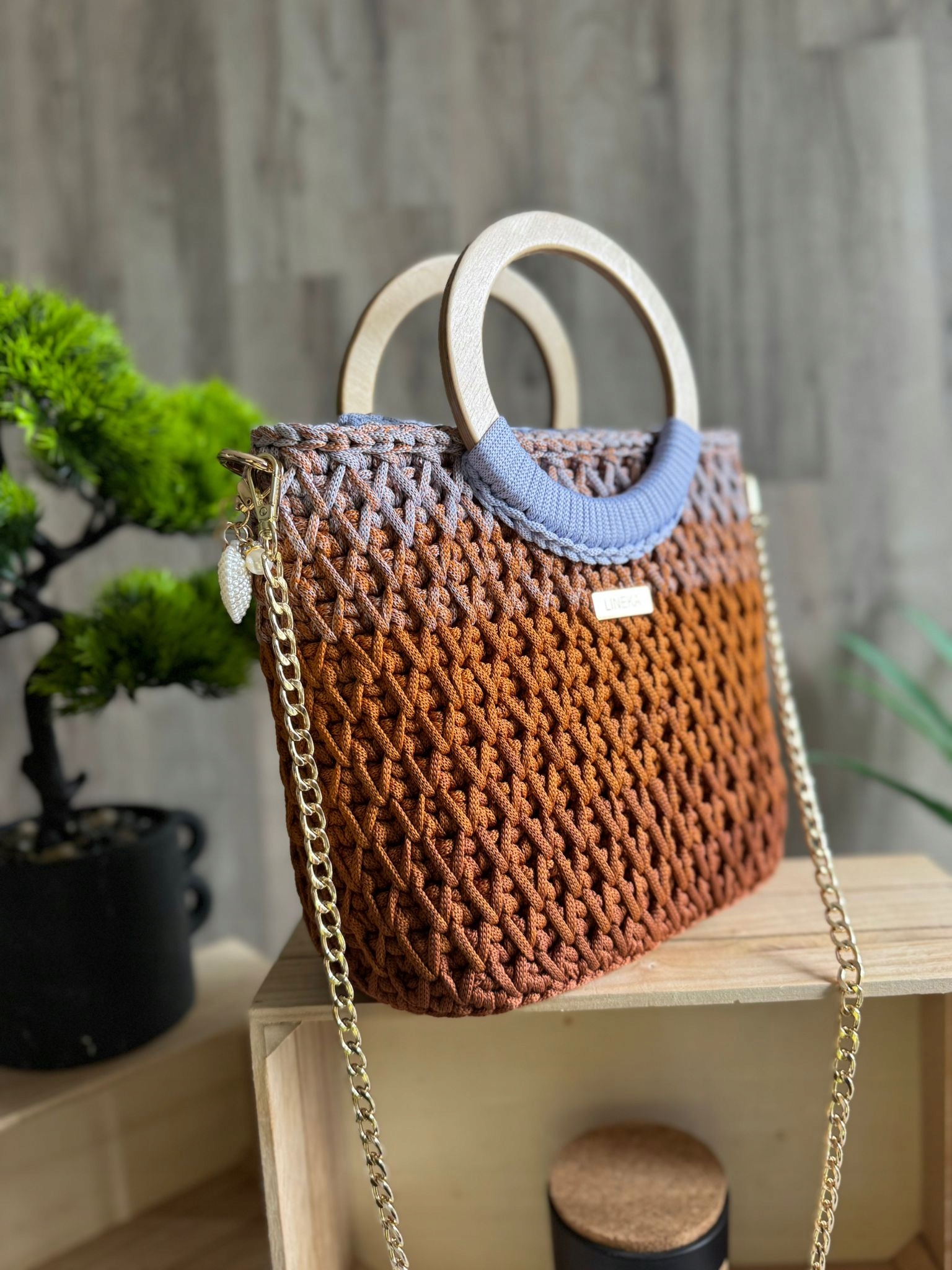 сумка ручной работы из коллекции Lineka представляет собой комбинацию современного ремесла с четким стилем. Модель янтарной омбре впечатляет глубокими, теплыми цветами - от карамели -коричневого до нежного синего. Тщательно сделанное плетение из полиэфирной струны подчеркивает уникальную природу сумки и обеспечивает его долговечность.