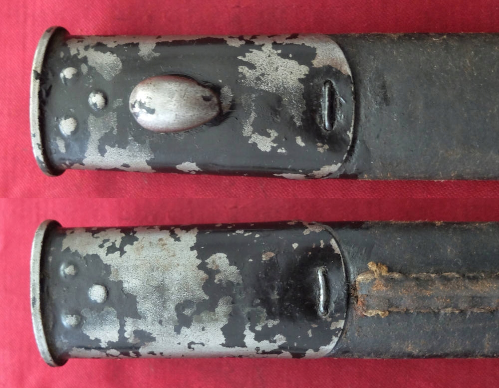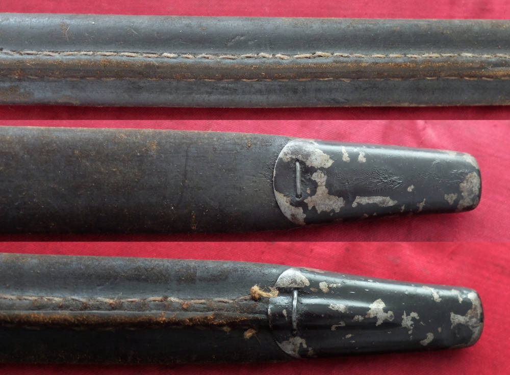 Ножны кожаные с металлической фурнитурой. Кожа плотная, без повреждений. Маркировка RE видна на нижнем фитинге. Клинок хорошо помещается в ножнах.