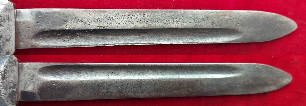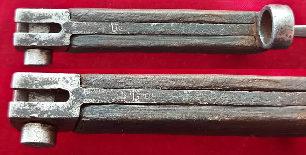 Версия без складного клинка. Копия видна на фотографиях. На лезвии имеется видимая отметка заточки. Накладки на ручки изготовлены из натурального дерева. Байонетный замок рабочий. На тыльной стороне рукоятки видна маркировка.