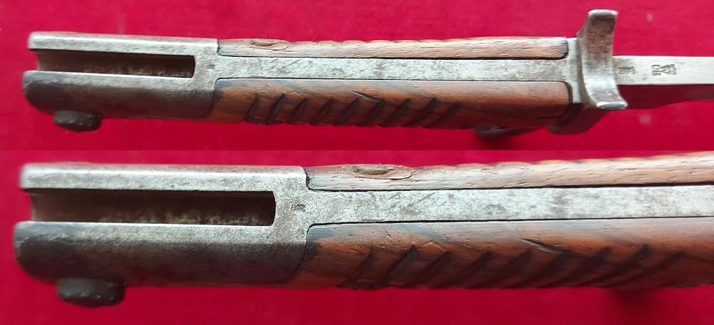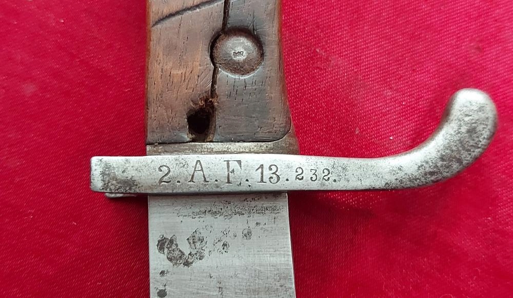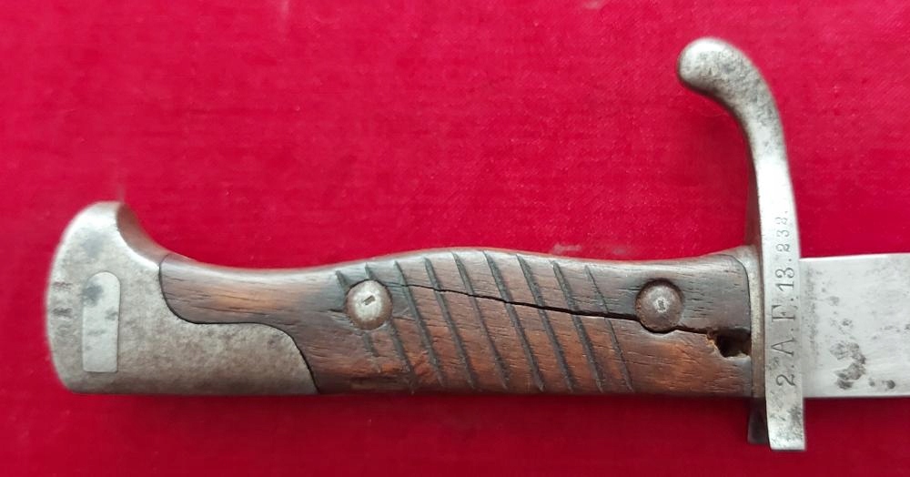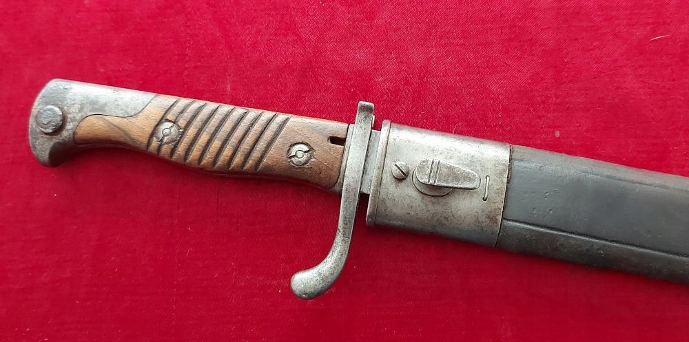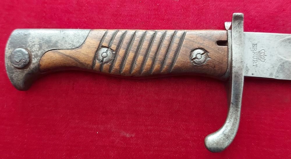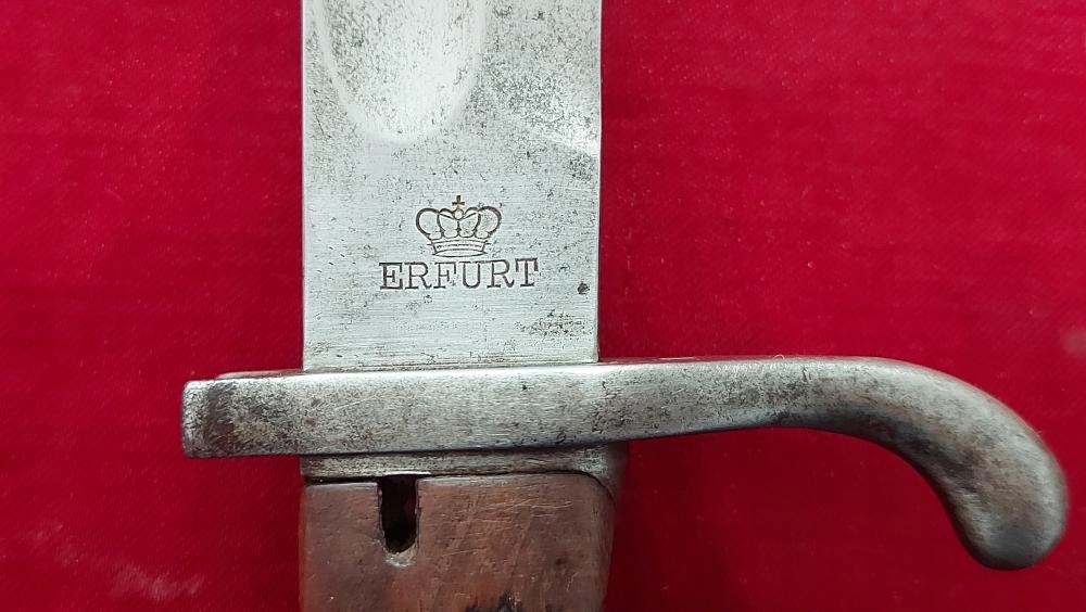 Экземпляр виден на фотографиях. Очень хорошо сохранился. Лезвие не заточено, аккуратно заточено. На пороге клинка маркировка производителя ERFURT под коронкой. На корешке видны военные поступления, под короной буква W, год поступления 1908. Накладки на ручки деревянные и оригинальные. На одном продольная трещина. Байонетный замок рабочий. На навершии, цевье и винтах обшивки видны прусские проколы.