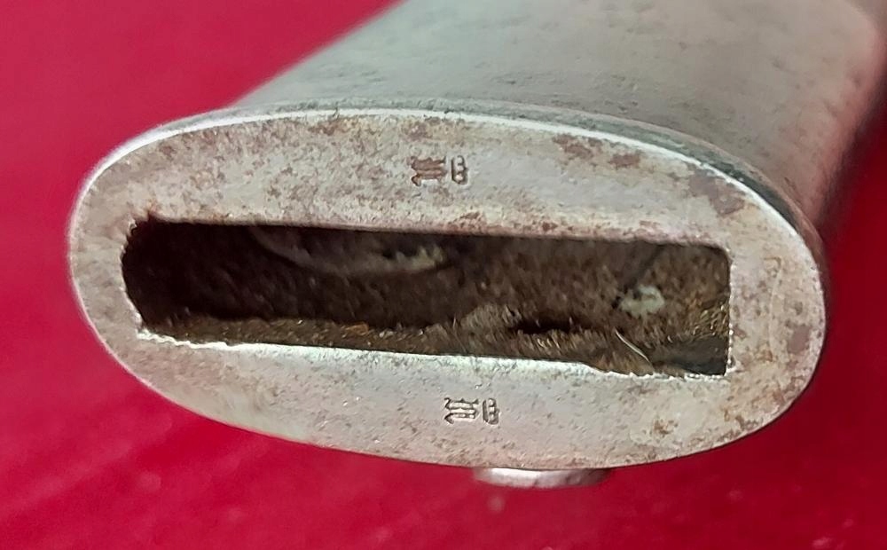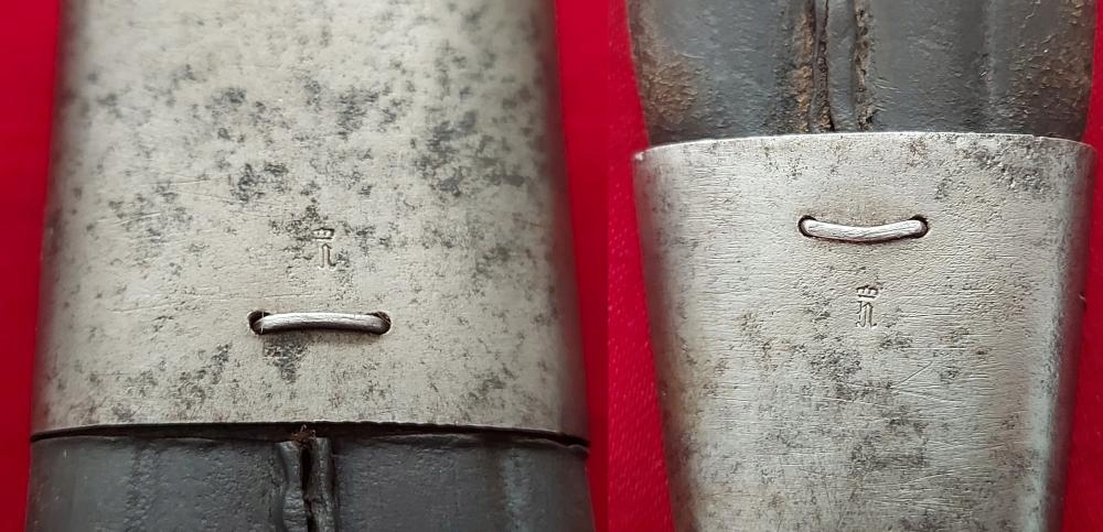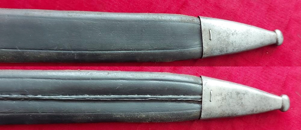 Ножны кожаные с металлической фурнитурой. Кожа очень хорошо сохранилась, жесткая, не имеет перегибов. Оригинальный шов полностью сохранен. На фурнитуре видны прусские точки. Штык не доходит до конца, не хватает 4мм.