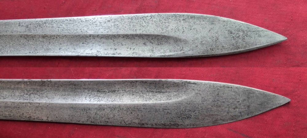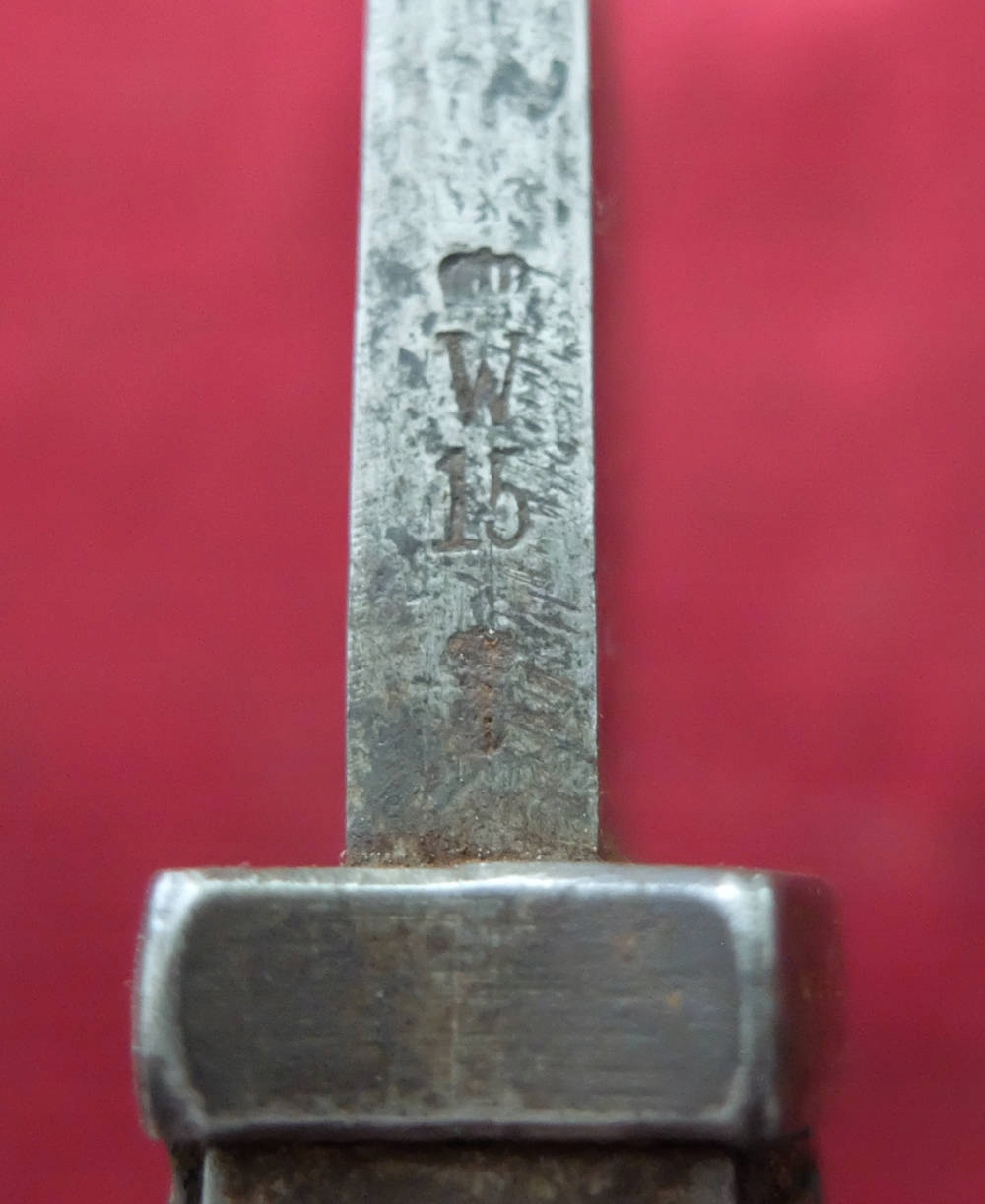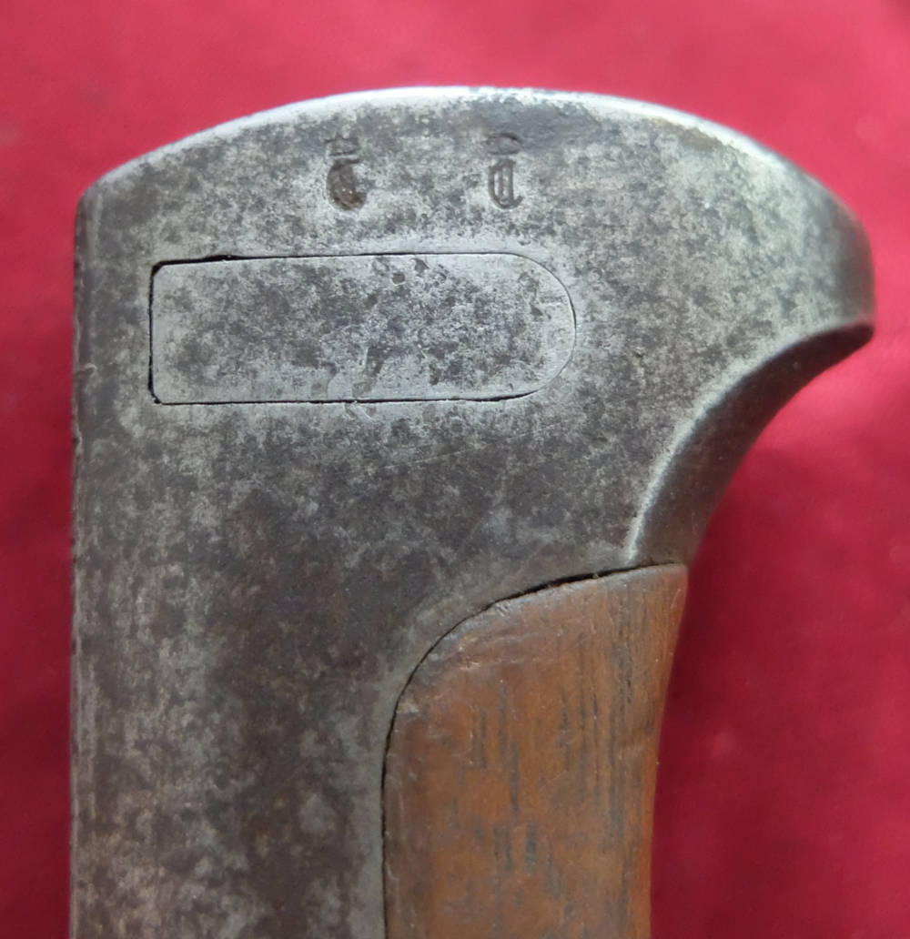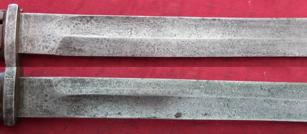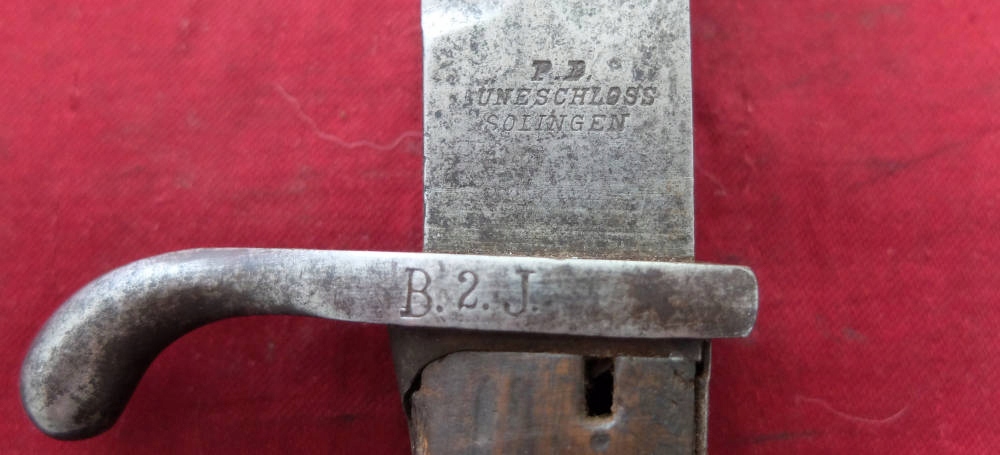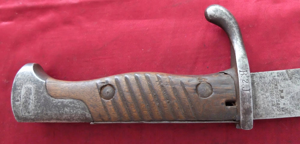 Экземпляр, видимый на фотографиях, прекрасно сохранился. Лезвие не заточено, не заточено. На пороге клинка подпись производителяП.Д. ЛУНЕШЛОСС ЗОЛИНГЕН. На тыльной стороне клинка прусские острия и год поступления: 1915. Накладки рукояти оригинальные, деревянные. Байонетный замок рабочий. Военные надписи повторяются на цевье, навершии и винтах обшивки. Маркировка воинской части B.2.J на цевье. - вероятно, второй баварский егерский батальон.
