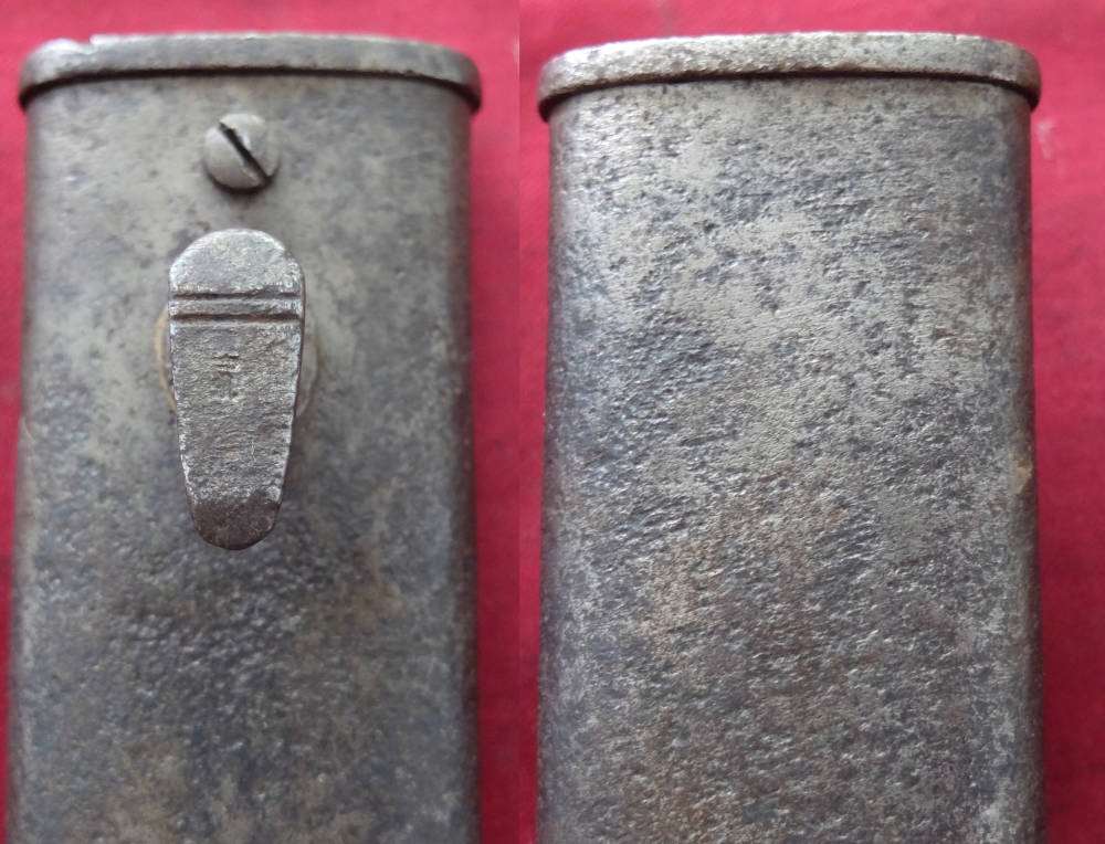 Ножны без отверстий, имеют небольшие вмятины, покрыты мелким зерном. Направляющая ножен функциональна и хорошо удерживает лезвие. На крючке и на входе видны военные поступления.