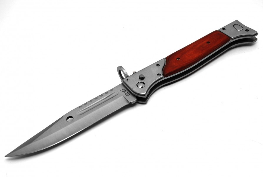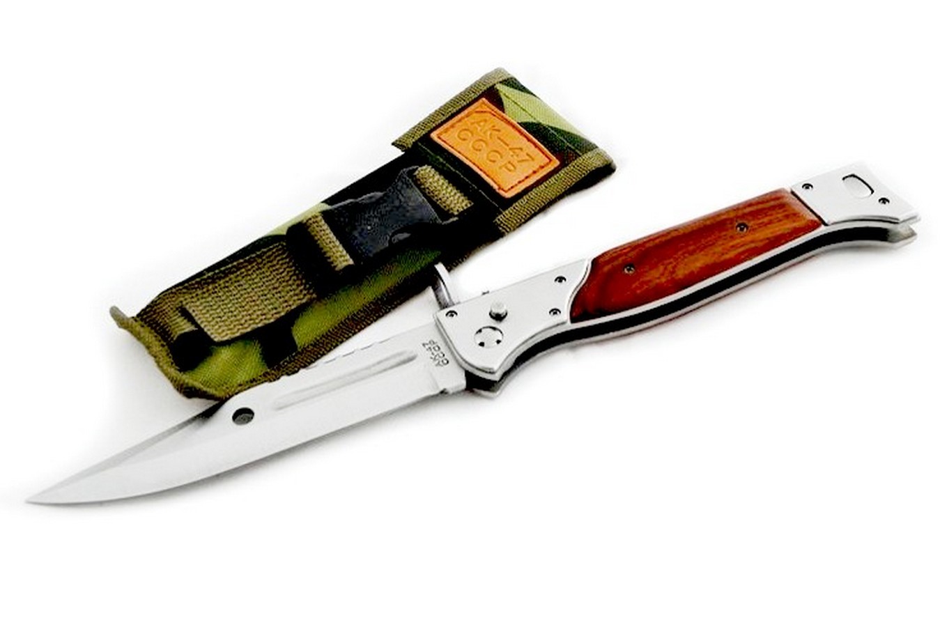 Выкидной нож АК-47 CCCP. Тяжелое, прочное лезвие из нержавеющей стали, деревянная подкладка. В комплект входит чехол, который можно прикрепить к ремню.