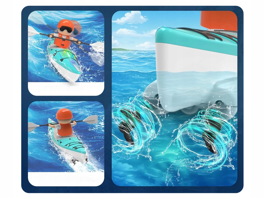 - Игрушка работает после контакта с водой. Игрушка с дистанционным управлением может подарить много часов удовольствия. Он идеально подходит для игр в бассейне, озере или в ванне. Каяк с гребцом также можно использовать для обучения детей каякингу. Посетите наш магазин Jokomisiada, чтобы ознакомиться с другим ассортиментом водных игр.