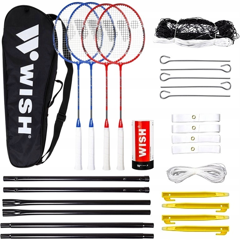 В комплект входят 4 ракетки, набор из 3 нейлоновых воланов, 2 складных столбика, нейлоновая сетка и ленты для разметки игрового поля, поэтому у пользователя есть все ему нужно начать тренироваться. Дополнительно набор упакован в чехол, что значительно облегчает транспортировку.