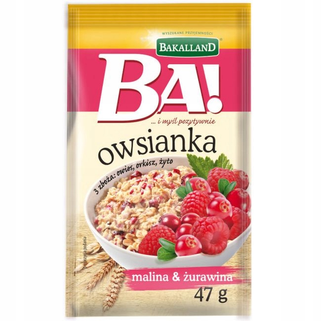 Каша с малиной и клюквной бакалландом BA! это три зерновых - ri, пшеница и написание в сочетании с вкусом малины и клюквы. Завтрак или вкусная закуска между едой. Просто добавьте молоко или воду.