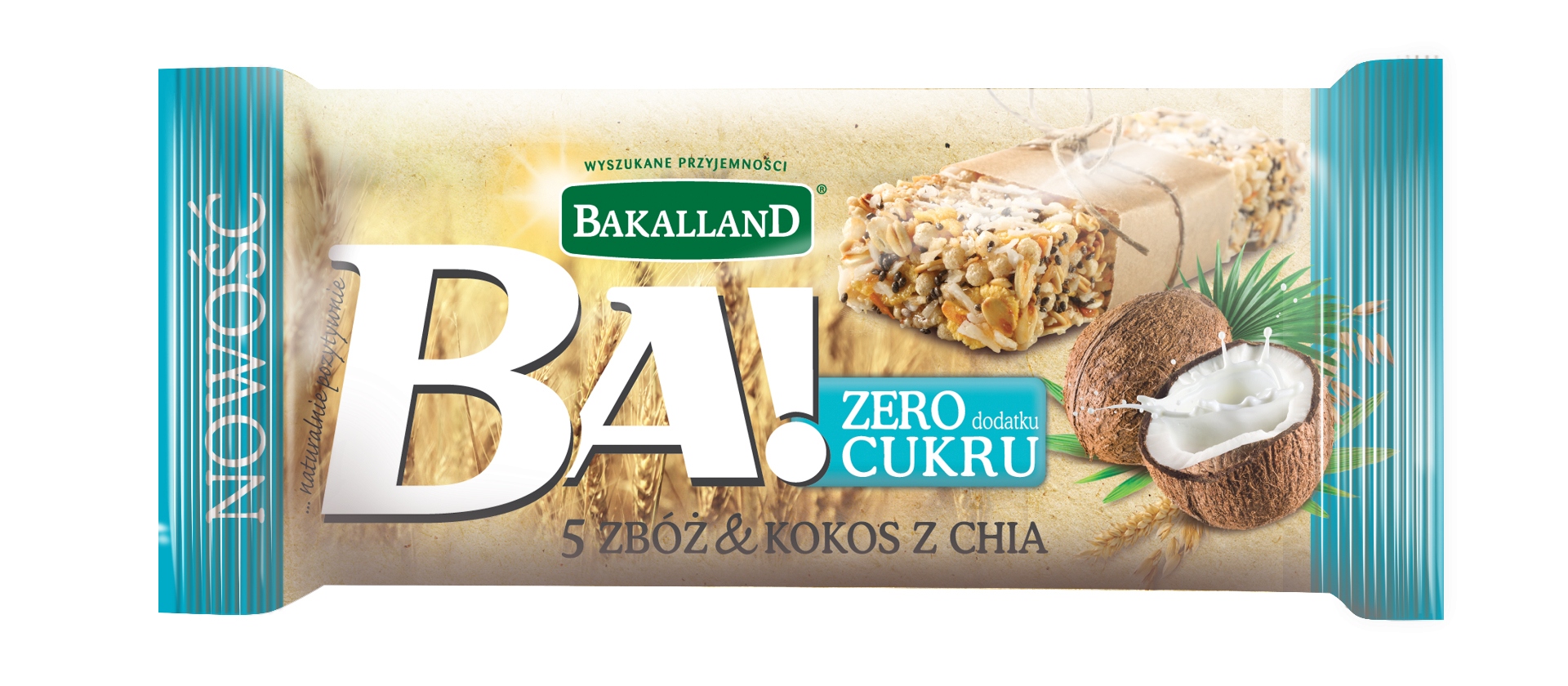 Злаковый батончик BA! – это сочетание семян чиа, хрустящих польских злаков (овса, пшеницы, ячменя, ржи и риса) и кокоса высочайшего качества.