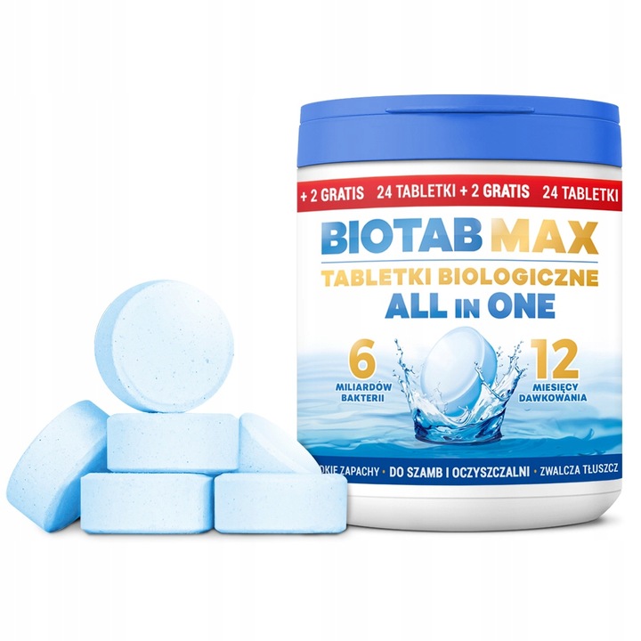 являются идеальным решением для людей, использующих различные типы очистных систем: от закрытых резервуаров до стандартных очистных сооружений с септиком и дренажем, а также биоочистных сооружений с системой аэрации. Эти таблетки устраняют неприятные запахи, удаляют поверхностную пленку, предотвращают чрезмерное замасливание системы, уменьшают накопленный осадок и стабилизируют биологическую микрофлору, что особенно важно в случае терапии антибиотиками, использования моющих средств или отсутствия адекватной оксигенации. Тем, кто начинает свой путь с собственной домашней станции очистки сточных вод, мы рекомендуем выбирать самые сильные микробиологические таблетки – BioTab Max All in One, которые обеспечивают дополнительный месяц приема в наборе из 24+2 таблеток.