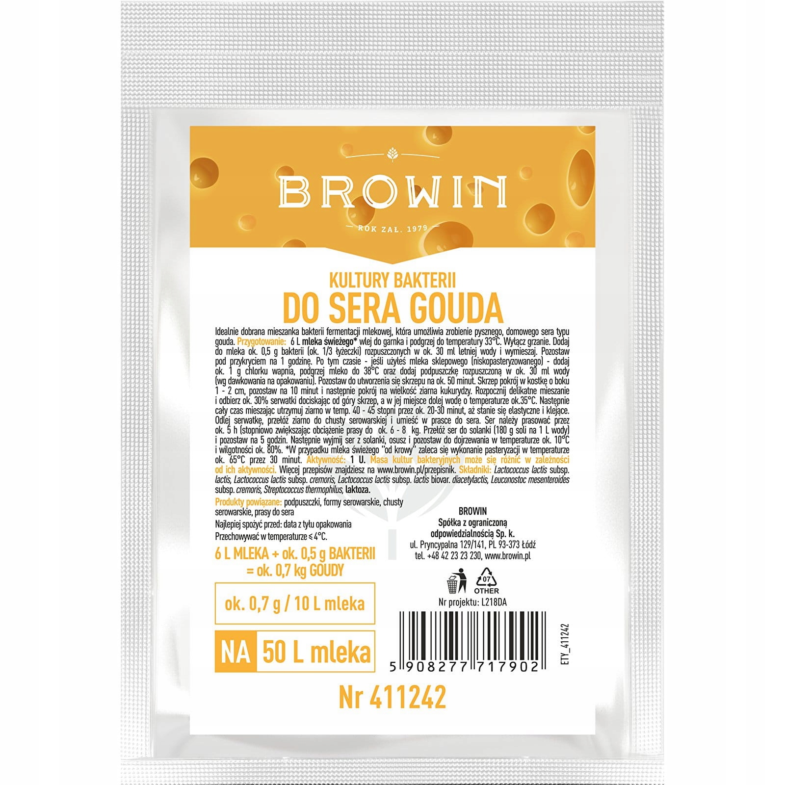 Идеально подобранная смесь бактерий молочнокислого брожения, позволяющая приготовить вкусный домашний сыр Гауда, который является прекрасной основой для здорового питания, в том числе безглютенового. Благодаря использованию сублимационной сушки — специального метода сушки, который является одним из самых совершенных методов консервации продуктов, эти культуры сохраняют весь свой потенциал в течение длительного времени.
