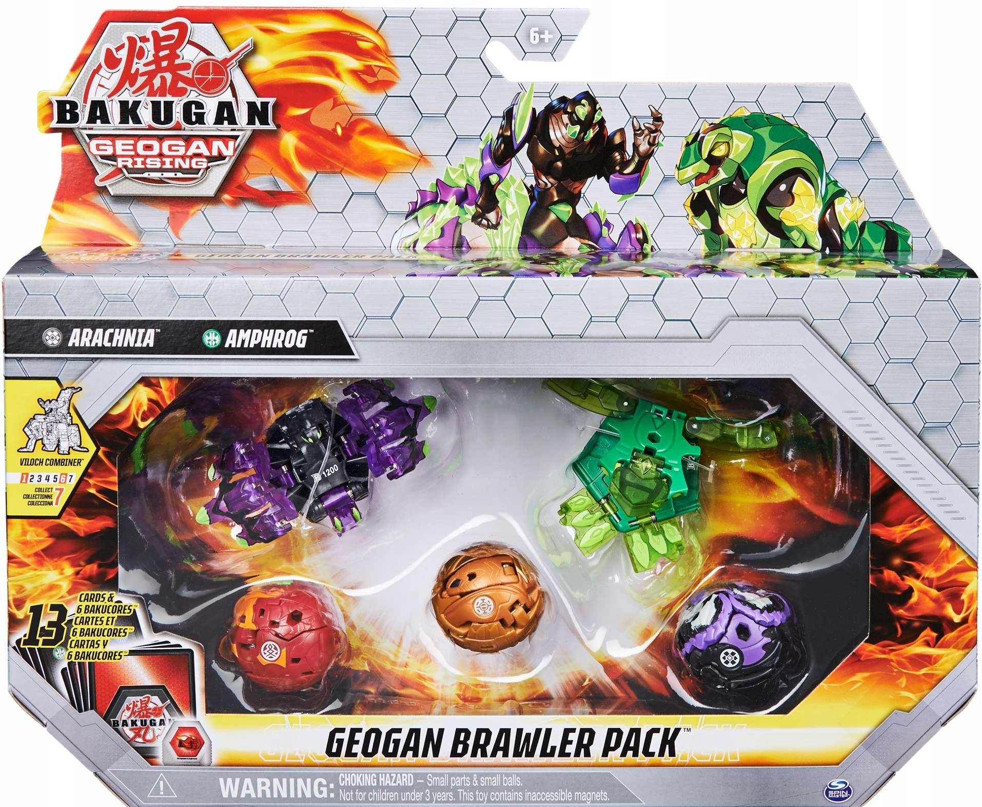 НаборBakugan Geogan Brawler Pack состоит из5 фигурок: Арахнии, Амфрога, Крустиллиона, Ниллиуса, Вилоча и7 карт способностей, 3 карт порталов, 3 персонажей карты, 6 жетонов BakuCore.