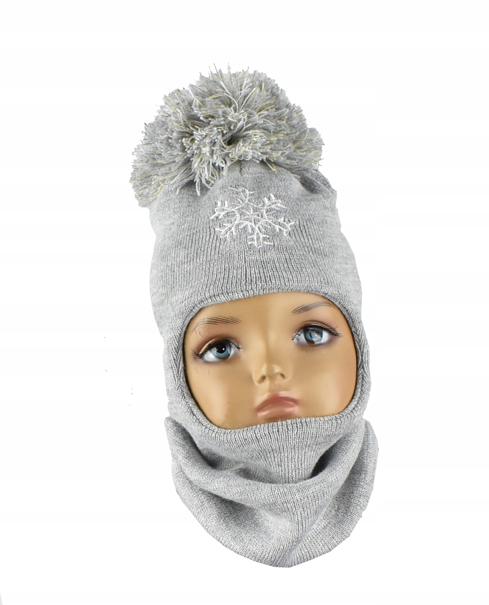 Балаклава для ребенка 1-3 лет, серого цвета с вышивкой белой снежинкой и помпоном из пряжи