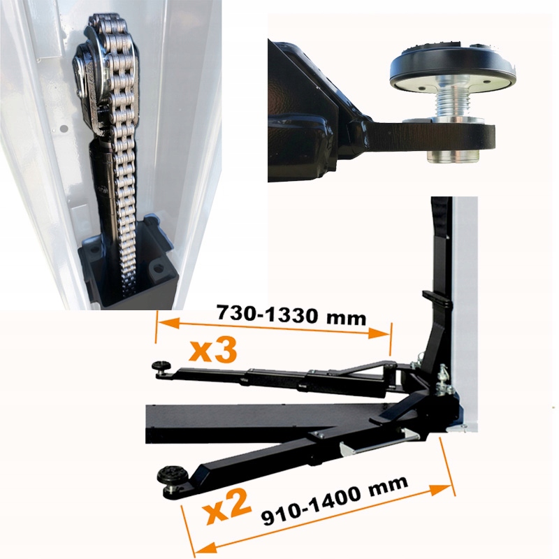 Усиленное звено цепи - подъемник Elpro оснащен роликовой цепью с тремя параллельными рядами звеньев, которые передают усилие от гидроцилиндров на подъемные тележки, такое решение существенно влияет на безопасность, долговечность, большую грузоподъемность и повышенную прочность на разрыв, что имеет решающее значение при подъеме более тяжелых автомобилей.